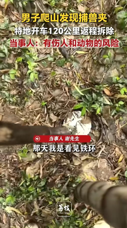 “听我说谢谢你!”近日,广东韶关,一男子在登山时发现了别人放置的捕兽夹,自己小心