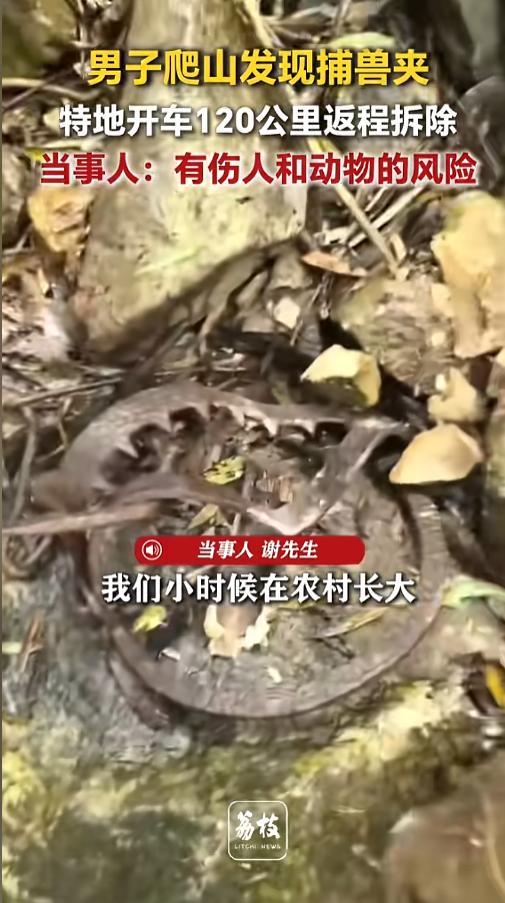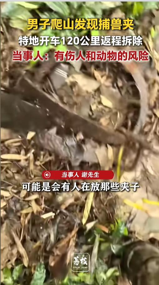 “听我说谢谢你!”近日,广东韶关,一男子在登山时发现了别人放置的捕兽夹,自己小心翼翼避开了。回到家后,他越想越觉得担心,不处理很可能会伤到别的人和兽。于是驱车120公里,回山上拆了捕兽夹。网友:无形之中可能救人一命! 据媒体3月30日报道,谢先生是一位登山爱好者,这一天,他在别处爬山时,发现了有人布置的捕兽夹。捕兽夹放的很隐蔽,多亏了谢先生小心,才避了过去。 他原本想直接把夹子破坏掉,但又一想,这是别人的东西,破坏别人的财物不太好,就没再理会,自己小心的离开了。 回到家之后,他辗转反侧,思来想去,还是觉得自己做的不稳妥。这么危险的夹子,放的这么隐蔽,别人不注意,很可能就被夹住了。夹一下,受伤得可严重了。 他觉得自己还是不能放任不管,既然发现了,就有责任把这个隐患排除掉。于是第二天,他又开车赶了回去,拿了根铁棒上了山。沿着昨天的记忆,找到了那个捕兽夹,把它触发了。这之后,他又在周边仔细搜寻了一下,确认没有其他的陷阱之后,才放心的离开。 网友看后表示,这夹子看起来像是偷偷捕猎的,周边也不做警示,肯定是不敢见人。万一真有人被夹了,破伤风跑不了,估计骨折也跑不了,放夹子的人也得被抓出来承担责任。男子做的这一件好事,起码救了两个人! 信息来源:《男子发现捕兽夹开车120公里返回拆除 当事人:有伤人和动物的风险