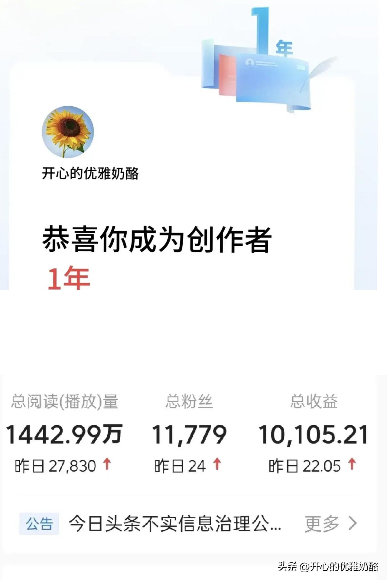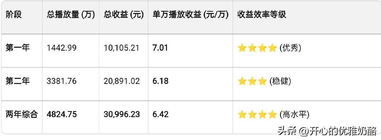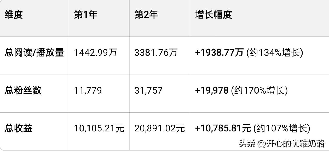 来头条两年了,收获的就是这一串串的数据。 把两年的数据发给豆包,人家给我分析的明明白白。 关键趋势分析 1. 流量爆发期:从第1年到第2年,总播放量实现了翻倍增长,说明内容的传播力在第二年显著提升,账号影响力正在扩大。 2. 粉丝沉淀高效:粉丝增长近2万,涨幅远超第一年,表明账号粘性增强,用户认可度高,具备了稳定的受众基础。 3. 收益稳步翻倍:总收益突破2万元,且涨幅与流量增长基本匹配,证明内容变现路径清晰,流量变现效率稳定。 不得不说豆包太专业了,不仅有文字还有表格(图三、四)。 做为当事人,一句话就能说明白,写同样内容阅读量增加,收益不增加,其实就是千次单价降低。 好在写头条只是热爱,有了这些数据就足够了。