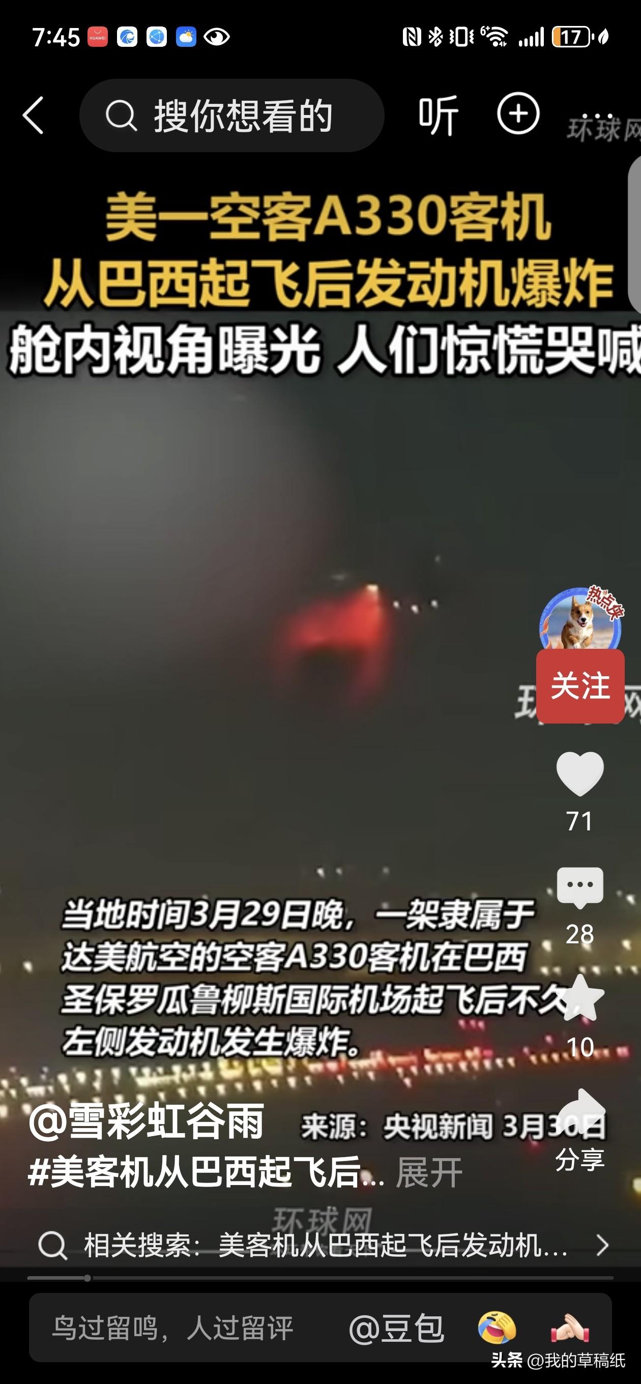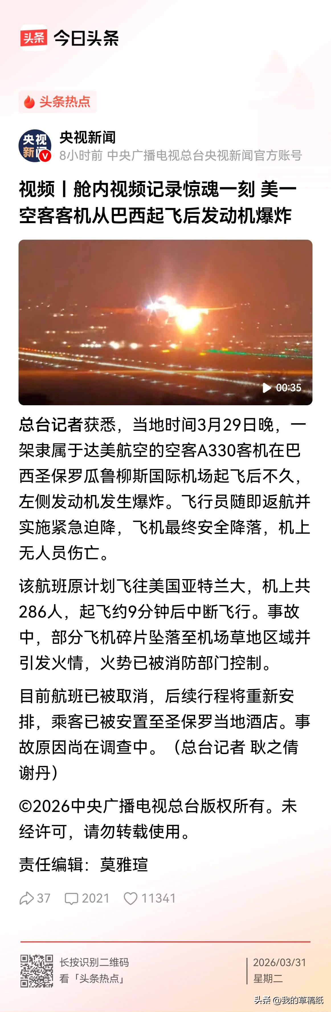 美一空客客机升空仅9分钟发动机突然爆炸!这一幕让机上286人经历了生死惊魂。网友,这些人恐怕从此再也不敢坐飞机了! 当地3月29日晚,达美航空DL104航班从巴西圣保罗起飞,执飞飞往亚特兰大航线。飞机刚升空不久,左侧发动机突发剧烈爆炸,巨大震动席卷机舱,金属碎片伴随着火光从高空坠落,直接砸向机场草坪并引发明火,现场惊险万分。 危急时刻,机组果断处置,立即宣布紧急状况并操控飞机返航迫降。最终,这架载有286人的空客A330安全落地,全员无一人伤亡。地面火情也被迅速控制。 从升空遇险到平安落地,短短几分钟堪称死里逃生,平安落地已是最大幸运。 为机组过硬技术点个大大的赞! 春日生活打卡季