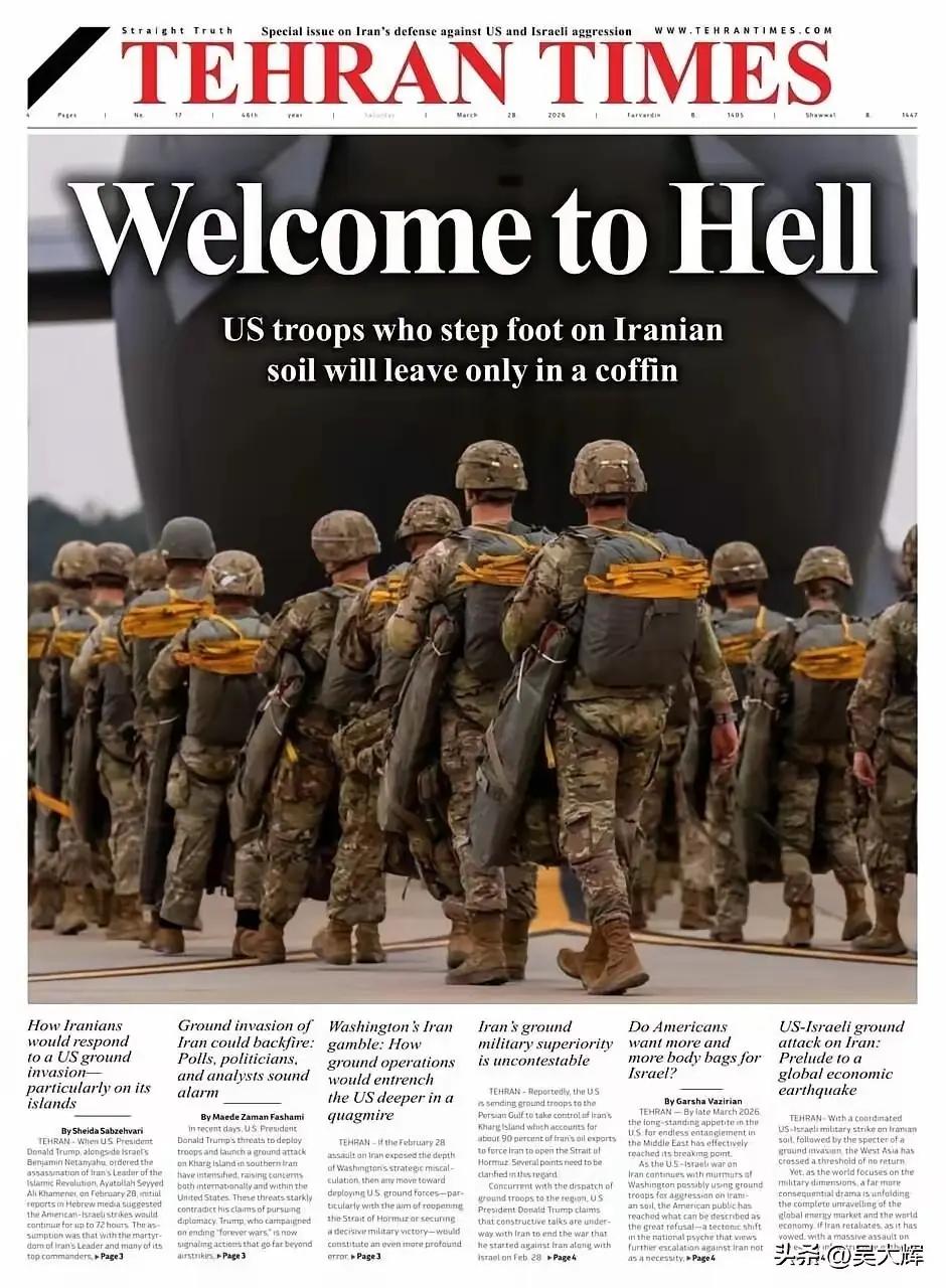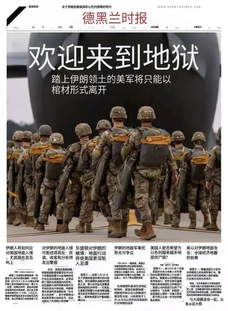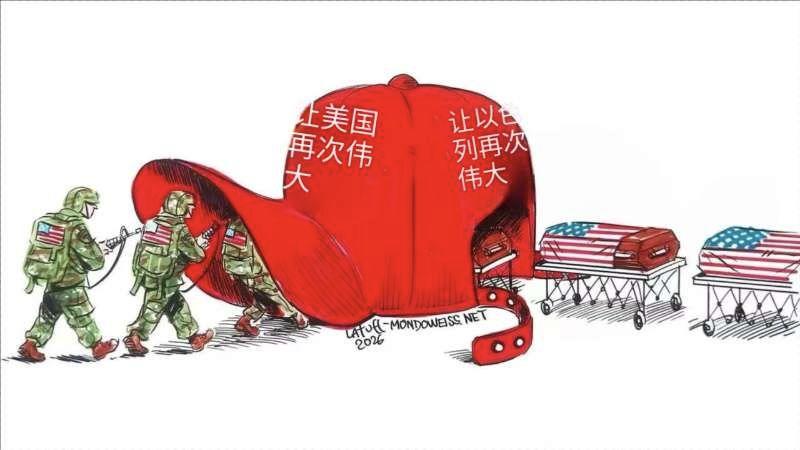美国大兵活生生的来,变成棺材回去 特朗普:让美国再次伟大!让以色列再次伟大! 德黑兰:欢迎来到地狱,踏上伊朗领土的美军只能以棺材的形式离开(图二四)。 而象征特朗普的红帽子这副漫画很好的诠释了特朗普和德黑兰的说法:美国大兵进入特朗普“让美国再次伟大”的红帽子,再出去就成为一具具棺材!这就是明确告诉美国,想派地面部队吗?来吧,迎接你们的是死亡!