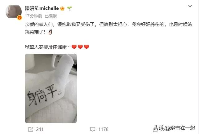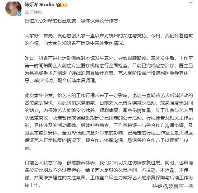 3月31日,陈妍希工作室发文,透露她在运动训练时意外致跟腱断裂。意外发生后,工作室第一时间陪她去检查,目前已完成手术,医生也制定了康复方案。她现阶段得严格遵医嘱静养,减少活动。 这次意外影响了她的工作行程,工作室决定暂停或调整近期部分公开活动。后续会和合作方沟通协调,发布最新安排。 虽然意外突发,但好在她状态平稳。希望陈妍希能好好养伤,早日康复,继续给大家带来更多精彩作品!