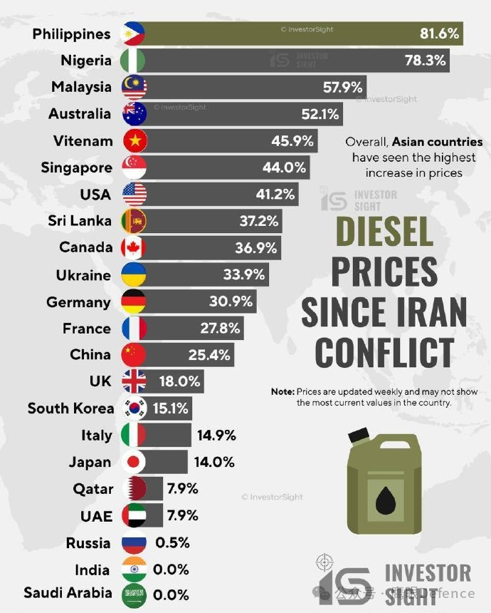 美国是全世界最大的石油消费国和出口国,特朗普曾表示不在乎油价上涨,但这种能源“防护罩”并未有效保护美国:自开战后,美国的柴油价格上涨了41.2%,远超其他主要西方国家,即便是排名第二的德国,柴油价格也不过上涨了30.9%,排名第五的意大利则上涨了14.9%。