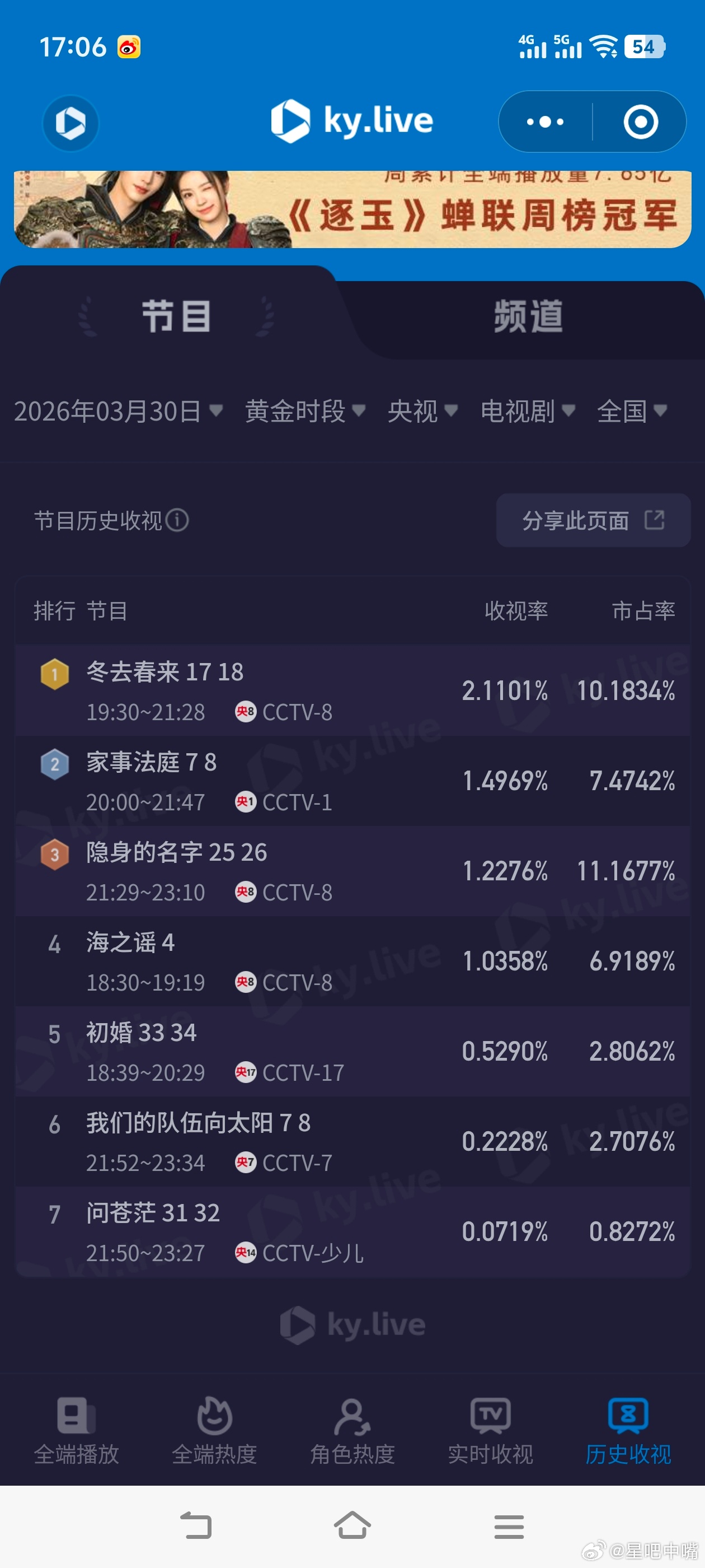 逐玉收官3月30日cvb收视日报《逐玉》大结局0.512!