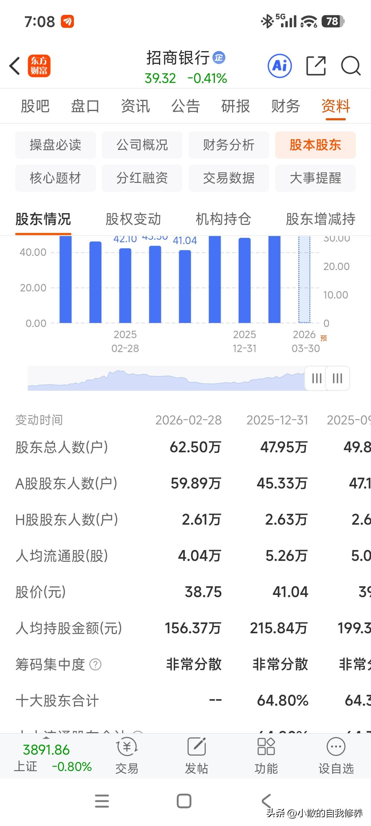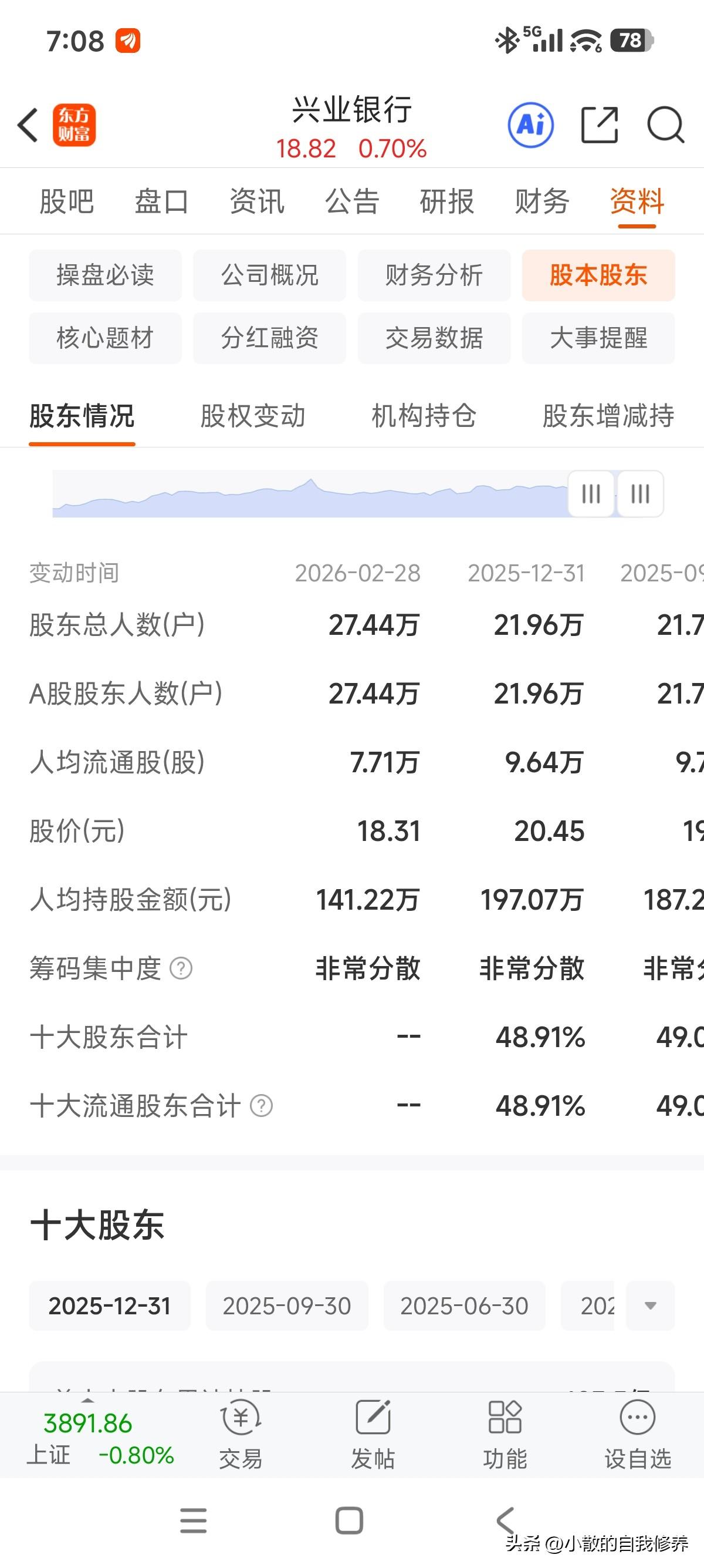 慢慢日线有出坑的节奏了,18的兴业银行,5.6%股息率感觉回来了二三年前的感觉! 从股东人数上看,一季度调整期间,机构一边跑一边喊着让大家做耐心资本,这是把时间的玫瑰留给了散户了,单二个月时间股东人数大增,兴业银行如此,招商银行也一样! 持股分散,连续性行情难了,安心等待等二个月后的分红到账,至少这种价格对于复投还算友好!