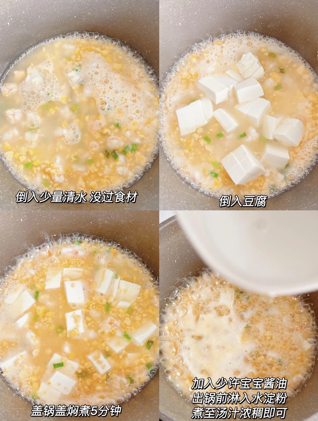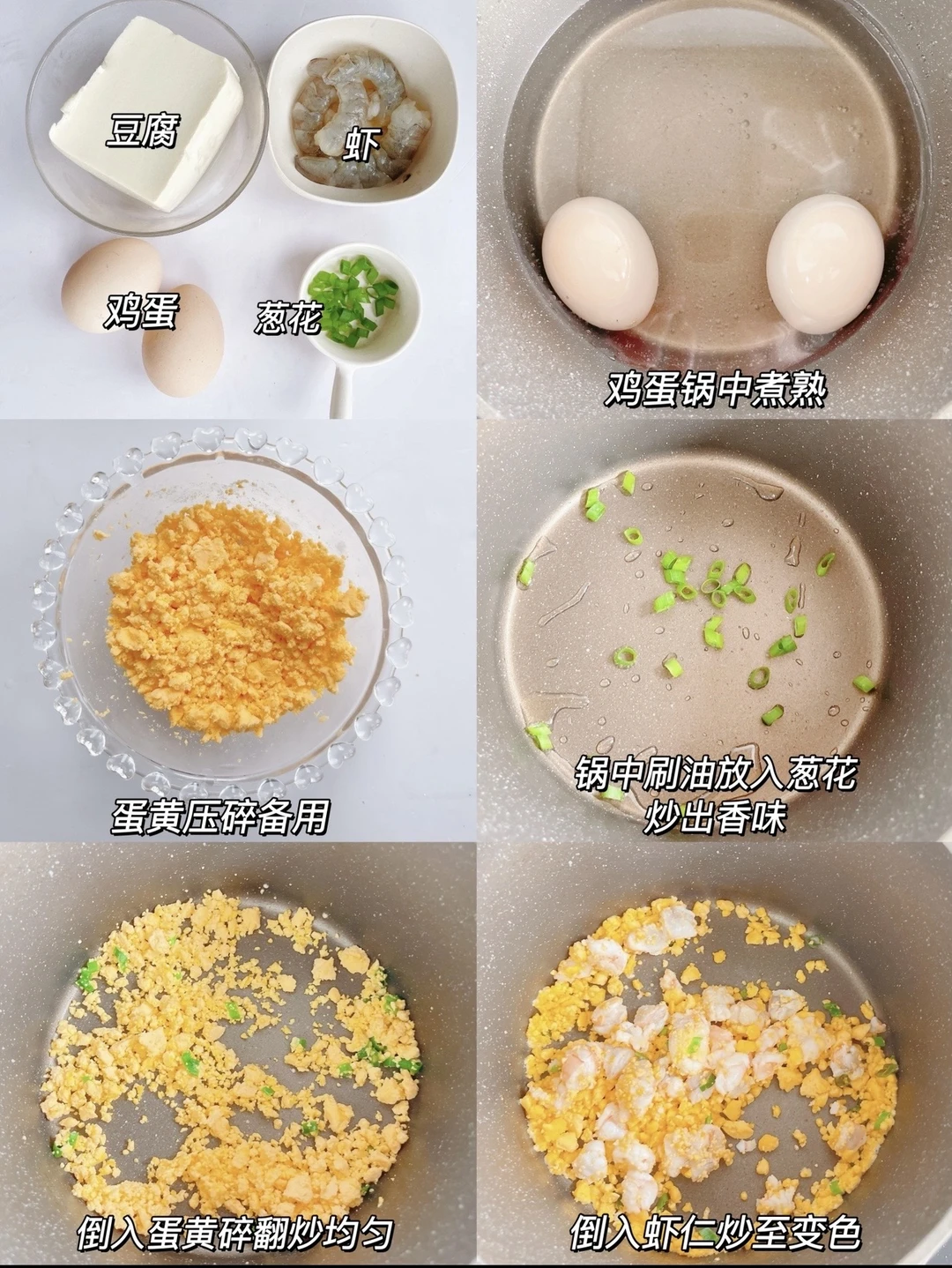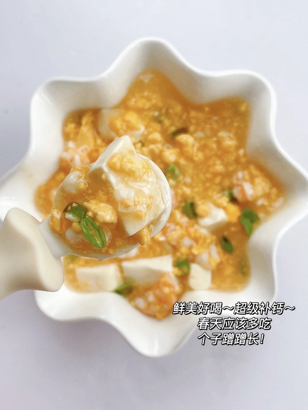 今天分享一道春天要多吃的食谱-蛋黄鲜虾豆腐羹 豆腐和虾的组合不仅鲜香滑嫩,而且还能补钙长高高!简单的食材搭配,真的巨下饭!做法也简单 一家老小都爱吃吃!快安排起来吧✌️ 🛒准备食材: ✔️虾 ✔️豆腐 ✔️鸡蛋 ✔️葱花 👩‍🍳做法: 1️⃣虾去头去壳去虾线,鸡蛋锅中煮熟,剥出蛋黄压碎 2️⃣锅中刷油,放入葱花爆香,倒入蛋黄碎翻炒均匀,再倒入虾仁炒至变色 3️⃣倒入适量清水,没过食材,倒入豆腐,加少许酱油,盖锅盖焖煮5分钟,出锅前淋入水淀粉煮至汤汁浓稠即可 - 大人吃的话加少许盐,真的超级美味 有疑问🤔️也可以评论区留言喔😄 💡关注我带您解锁更多辅食制作