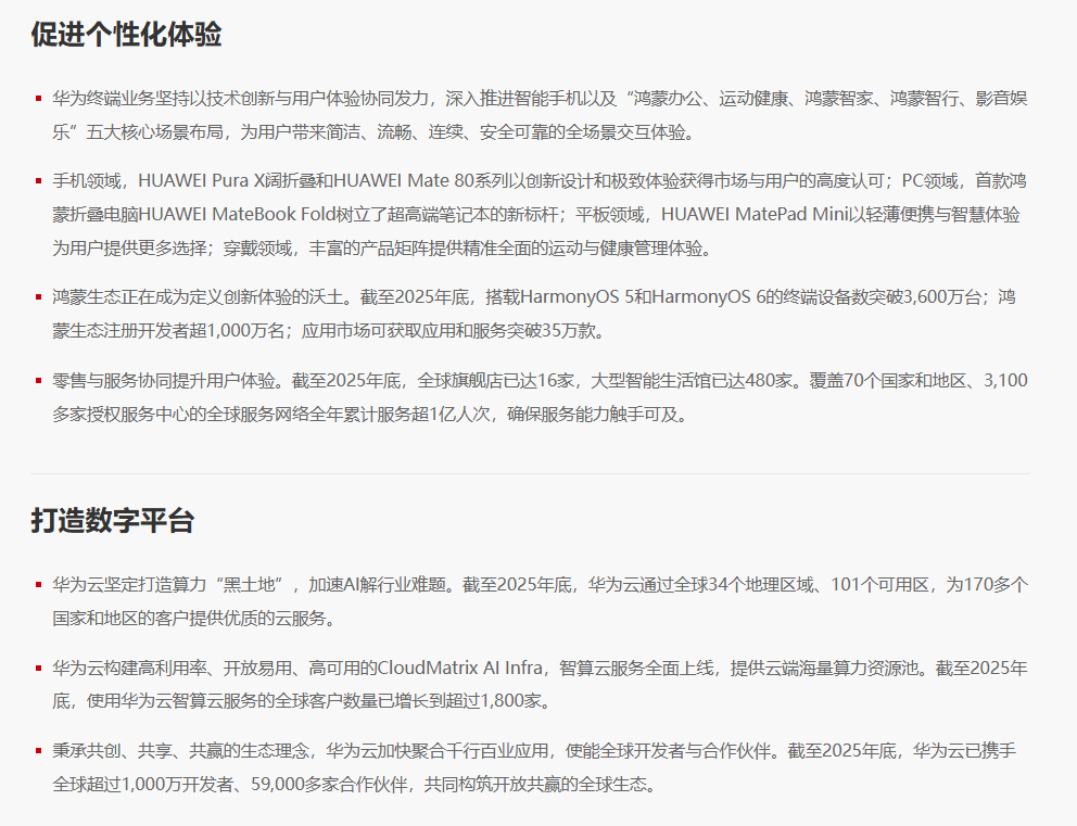 感谢客户的信任,感谢消费者的选择,你们的认可和批评,都是我们前进的动力;感谢全球供应商、合作伙伴、开发者的协同,让我们在并肩同行中,看到了生态繁荣的未来;感谢每一位员工的付出,你们用坚韧克服困难,用专业创造价值,用热爱激励彼此;感谢每一位家属的支持,你们的默默守护是华为员工最暖的后盾、最硬的支撑。