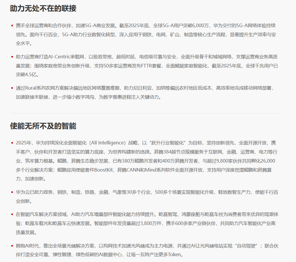 生态的繁荣是产业发展的基础。鸿蒙、鲲鹏、昇腾和华为云生态正在茁壮成长。截至2025年底,鸿蒙开发者超过1000万,鸿蒙生态跨越了生死线,鸿蒙5.0以上终端设备超过3600万;鲲鹏已发展6800多家合作伙伴、380万开发者;昇腾已发展3000多家合作伙伴、400万开发者;1000多万华为云开发者与我们并肩同行,降低智能技术的应用门槛、用AI解行业难题。