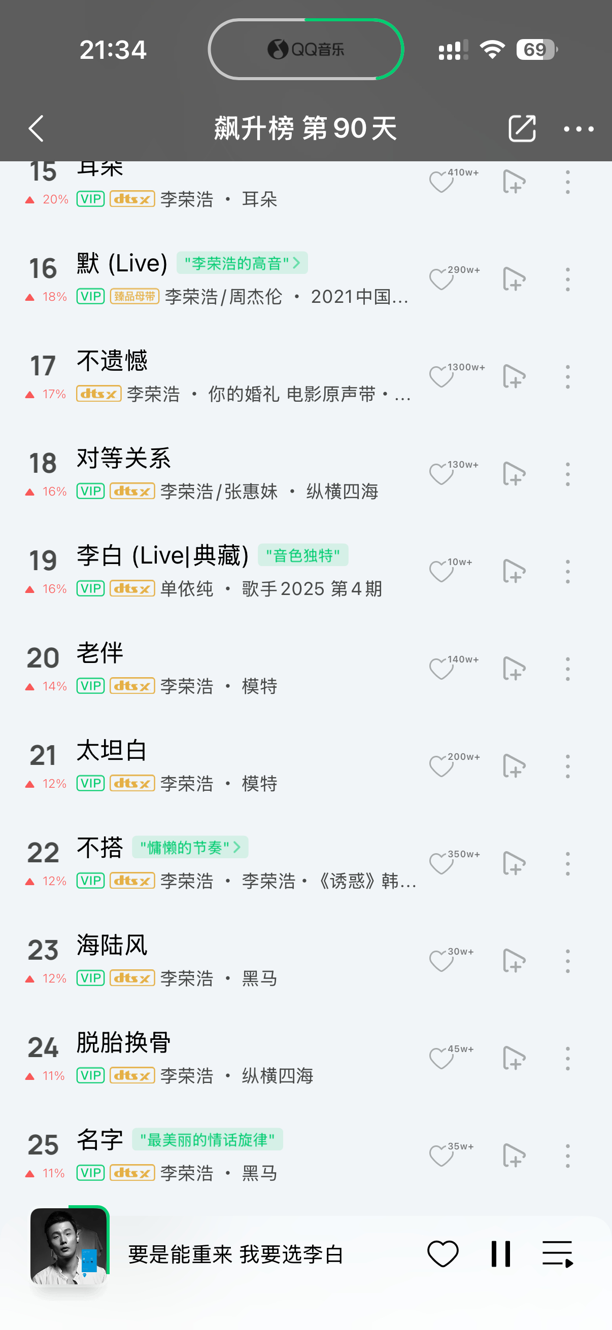 此时此刻的QQ音乐飙升榜前25,除了一首单依纯翻唱他的《李白》排在19,其它24首歌都是李荣浩的,这战绩如何!