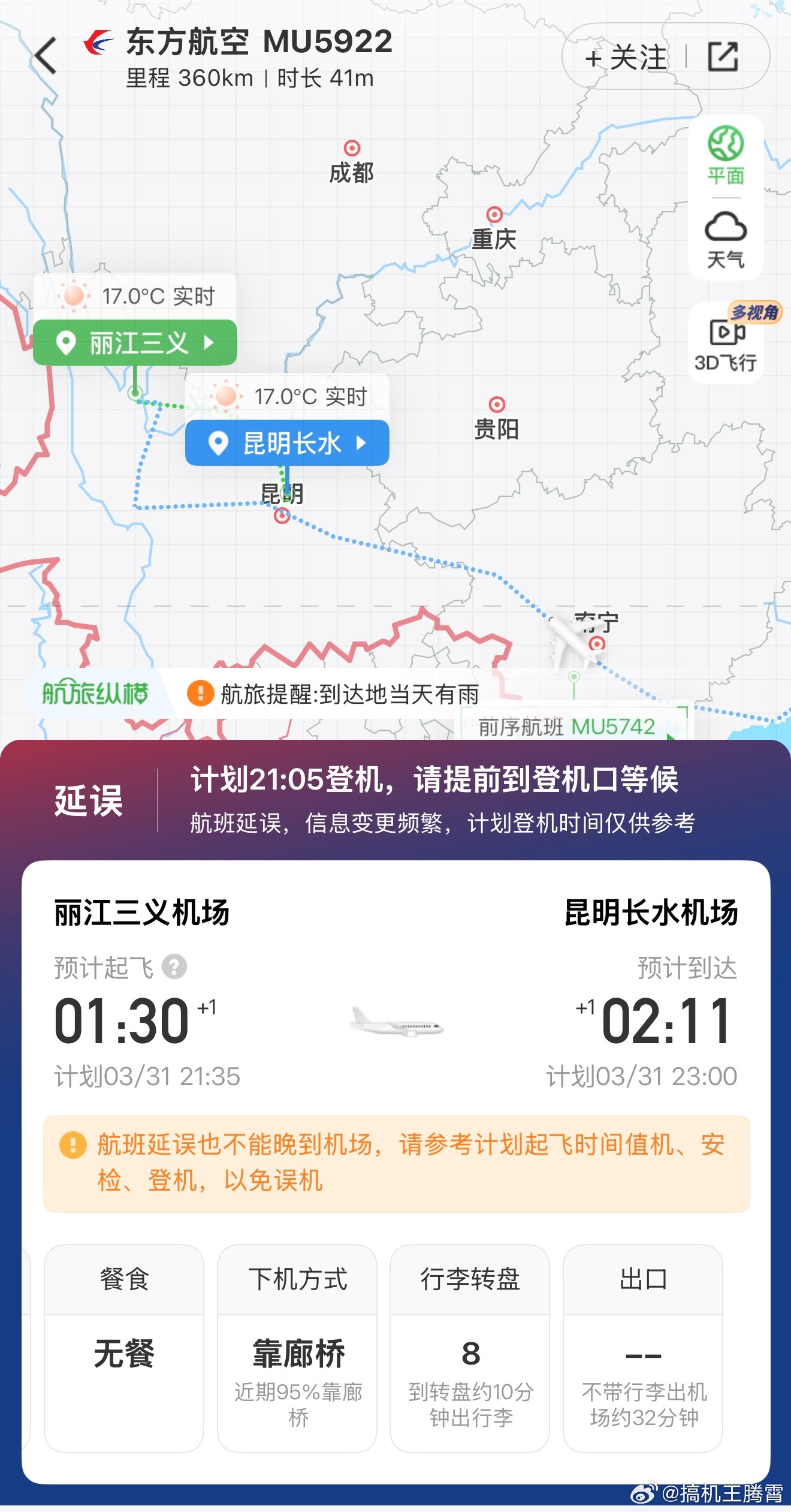刺激,第一次感觉丽江到昆明如此之遥远,前序航班1点才到,我这航班从21:35延误