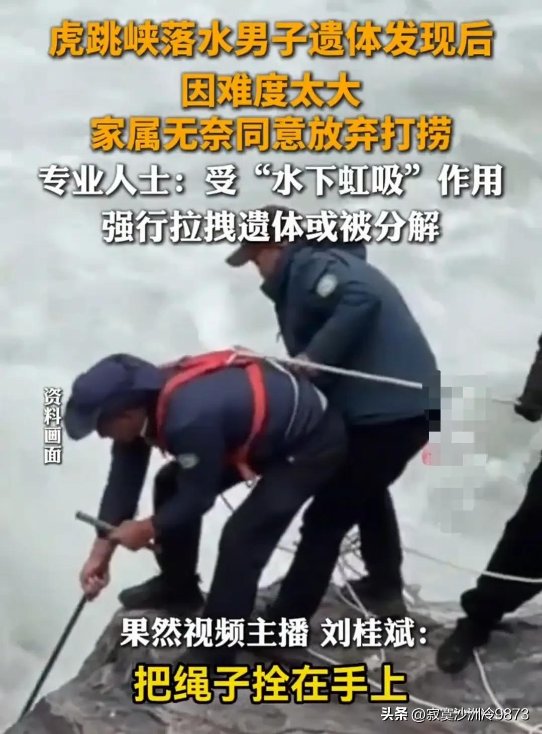 令人唏嘘的“虎跳峡”落水遇难男子,不仅赔上了性命,甚至连入土为安都成了难事! 2月25日,那名因洗不锈钢杯子而落水遇难的男子,由于水底虹吸作用过强,再加上打捞时使用蛮力,难以保证其遗体的完整性,家属最终无奈放弃打捞。 只因洗杯子时不听劝阻,非要前往未开发的水边,这位落水遇难男子连传统文化里的入土为安都难以实现,实在令人难过! 出门旅游,既要欣赏美景,也要约束好自己。愿大家高兴出门,平安回家!
