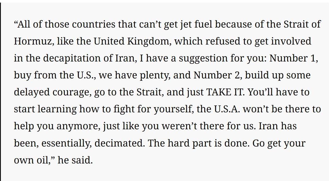 特朗普喊话英国:自己去找油吧 当地时间周二早上,特朗普Truth Social上发了一条帖子点名英国,前往霍尔木兹海峡去找油,并表示各国需要“开始学习如何为自己而战”。 他在帖子中写道:“那些因霍尔木兹海峡而无法获得航空燃油的国家,比如英国(该国拒绝参与对伊朗的打击行动),我给你们一个建议:第一,从美国购买,我们有充足的供应;第二,增强一点勇气,前往霍尔木兹海峡,直接夺取它。你们得开始学会自己为自己争取资源了,因为美国不会再帮你们了,就像当初你们没有帮助我们一样。伊朗基本上已经被摧毁了。艰难的部分已经完成。去获取你们自己的石油吧。”