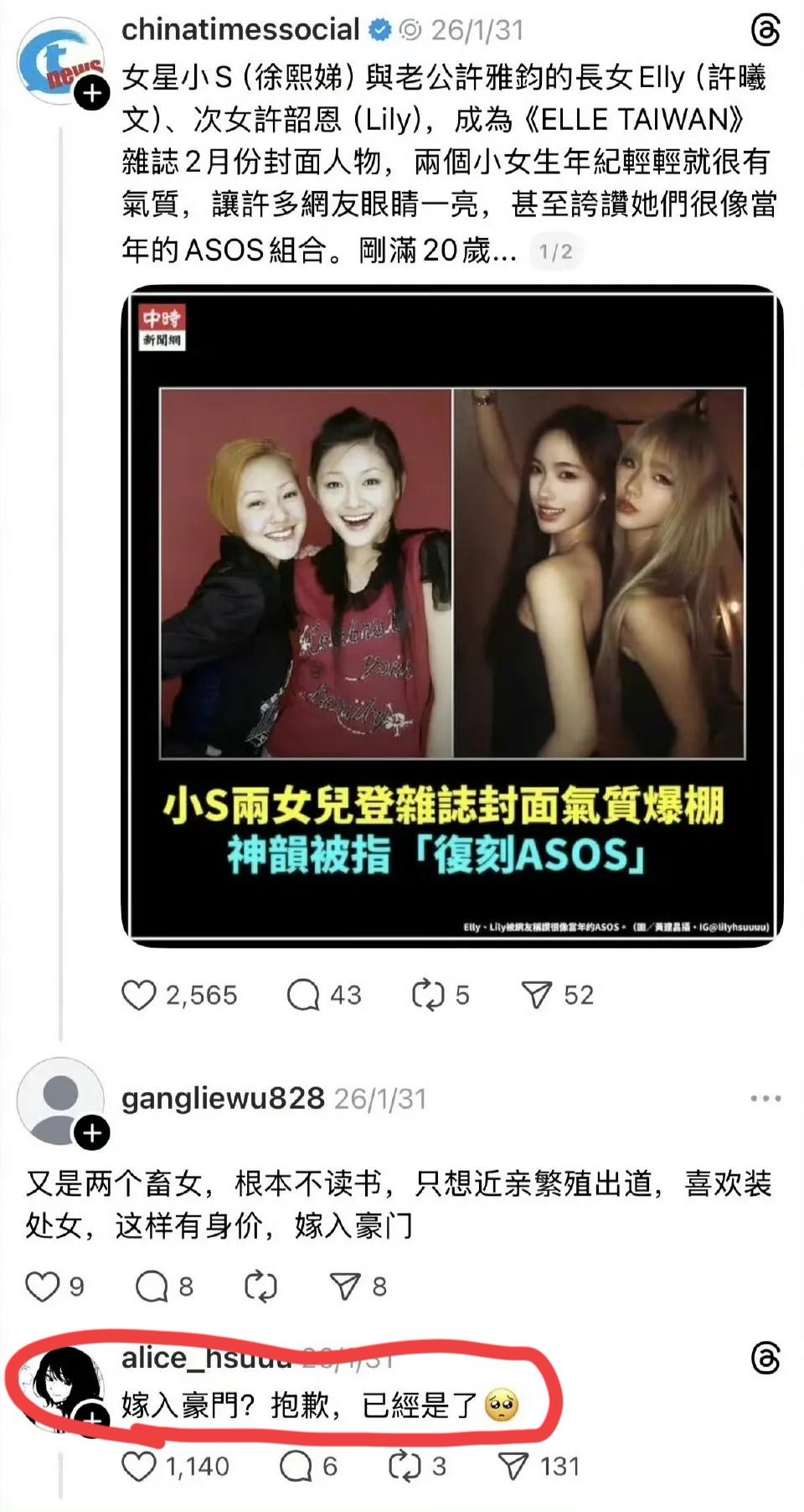 🔥14岁许老三霸气回怼!一句话封神,真正的豪门嫡女自信! 小S的三个女儿,最近又因为大女儿和二女儿登上杂志封面引发热议。台媒夸她们“气质爆棚,神韵复刻ASOS”,本是好事,评论区却涌入了大量恶意。 有人竟留言诅咒:“根本不读书,只想近亲繁殖出道,装处女想嫁豪门”。 万万没想到,14岁的许老三刷到后,直接霸气回怼: “嫁入豪门?抱歉,已经是了!” 一句话,把那些酸评的网友震住了。 不得不说,许老三比起小玥儿,确实更显自信张扬。虽然许家目前算是中产,大S身后的珠宝包包也一直争议不断,但这份“我就是豪门”的底气,本身就是她最昂贵的铠甲。 回顾历史,敢说“我就是豪门”的,从来都不是靠家世,而是靠实力和气场。从范冰冰到罗霈颖,她们靠的是独立的精神和不卑不亢的风骨。 许老三年纪虽小,却懂得用锋芒保护自己和家人。在这个充满舆论的世界里,内心的强大,永远比出身更重要。