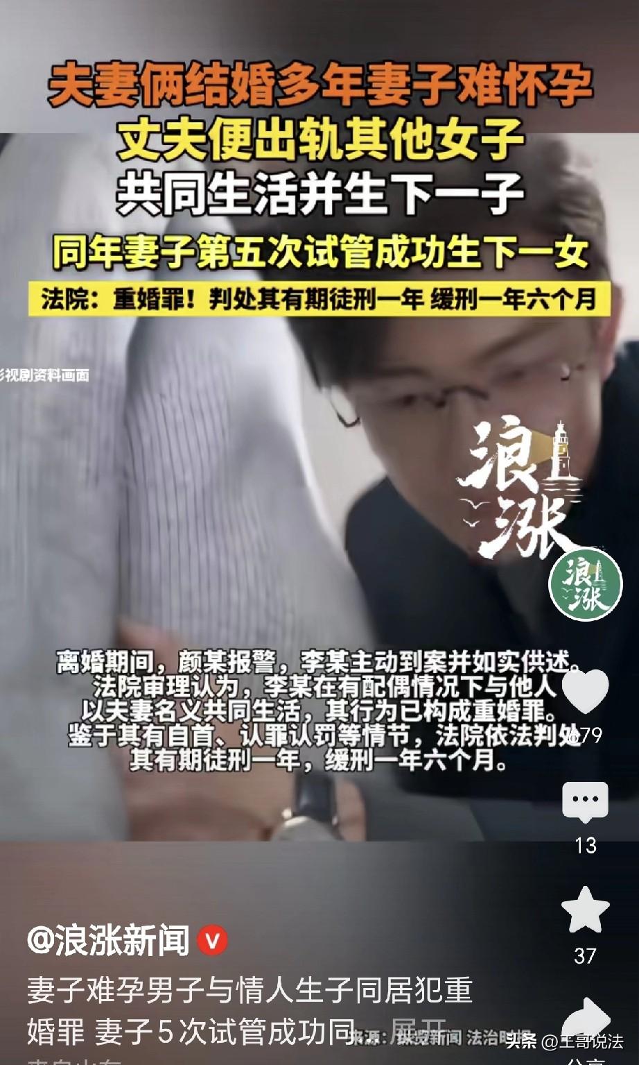 海南海口,一男子结婚之后,发现妻子迟迟不孕,他陪妻子去做试管婴儿,可4次都失败了,男子立刻在外找了个女子,女子给他生下儿子,可这时,妻子第5次试管成功了,很快生下一个女儿,可男子不稀罕了,他搬走和婚外女子同居,偶尔回来看一下女儿,之后,男子和妻子协议离婚,妻子气不过,以男子重婚罪告到法院,法院判了! 2003年,李某和颜某相识相恋,没过多久,俩人办理了结婚登记。 新婚燕尔,俩人十分的幸福,李某只盼着妻子颜某赶快给他生个大胖小子。 可是他日思夜想,儿子没有盼来,却发现妻子的身体难以受孕。 李某急了,不孝有三,无后为大,不能生孩子,让他如何给家人交代? 李某和妻子商量,不行去做试管婴儿吧,妻子满心的愧疚,在李某的陪同下来到了医院。 可每一次进手术室,颜某都非常害怕,做试管婴儿需要打针吃药取卵,身体受罪不说,心里的压力更是大得惊人。 可命运好像在开玩笑,一连4次试管,全是失败,李某从最初的耐心,慢慢变的很不耐烦。 2011年,李某在外面认识了李某某,俩人相见恨晚,很快就发生了不正当的关系。 不久李某某怀孕,李某高兴,马上就能实现当爹的愿望。 谁知这时,消息传来,妻子颜某的第5次试管婴儿,竟然成功了! 妻子喜极而泣,这本该是天大的喜事,可此时此刻,对李某来说,孩子的来临,却成了烫手的山芋。 最后,他一横心,跟颜某摊了牌,说他在外面有别的女人了,女人给他怀了孩子,他选择要和外面的女子去过日子。 妻子悲痛欲绝,可是她不忍心离婚,更不忍心不要孩子,这孩子来的太难了。 2012年10月,外面的李某某生了个儿子,李某乐得合不拢嘴,李家有后,这才是最重要的。 同年12月,颜某生下女儿,可李某毫不在意,折腾了这么多次,还不是只生了丫头片子。 李某干脆搬出了家,跟李某某过起了日子,对外以夫妻名义自居。 他得意洋洋,把正妻和刚出生的女儿丢在一边,只是偶尔才回去看上一眼。 颜某为了女儿,忍了他整整12年之久,在这期间,她承受了无数的辛酸和委屈。 直到2024年9月,两人终于协议离婚,李某以外,他终于可以扬眉吐气,好好和女子儿子过他的日子。 可颜某咽不下这口气去,十几年呀,太欺负人了! 俩人离婚期间,她以李某重婚报警,警方随即传唤到了,李某对此供认不讳。 法院经过审理认为,李某在婚姻存续期间,跟别的女子以夫妻名义同居生活,这妥妥的就是重婚罪! 婚姻从不是生育的工具,忠诚更不该因求子不顺就被轻易抛弃。 如果实在想要孩子,或者对妻子不满意,完全可以早早提前离婚啊,不要人家千辛万苦生出来了你又离婚。 妻子历经5次试管之苦,换来的却是长达十余年的背叛,搁谁身上都不愿意。 男子大概以为,只要离婚了就没事,但法网恢恢,犯过的错,迟早是要还的。 《刑法》第258条规定:有配偶而重婚的,或者明知他人有配偶而与之结婚的,处2年以下有期徒刑或者拘役。 很多人以为重婚就是领两次结婚证,其实不是,法律里的重婚分两种:一种是法律重婚,就是已经有妻子或丈夫了,还跟别人领结婚证的。 另一种是没领证,但跟婚外的人以夫妻名义过日子,比如对外称是夫妻、一起住被邻居当成夫妻,或过年过节以夫妻名义走亲戚之类的。 李某就是典型的第二种重婚,他跟颜某还没办理离婚手续,就搬去跟李某某同住,对外还以夫妻名义生活,这就符合重婚罪的条件了。 也许有人认为,李某是因为老婆生不出孩子才找别人,情有可原。 但法律不管你有啥苦衷,只要你在婚姻存续期间,跟别人以夫妻名义共同生活,就犯了重婚罪。 法院经过审理,考虑到他主动认罪认罚,有自首情节,因此可以从轻从宽处理。 最终法院判决,李某重婚罪成立,判处有期徒刑1年,缓刑1年6个月。 虽然李某只被判了缓刑,可带来的伤害却是无止尽的,他的不负责任,对两个孩子来说,也会造成巨大的影响。 李某不管不顾,无视法律,终归要对自己行为付出代价。 对此,你怎么看?