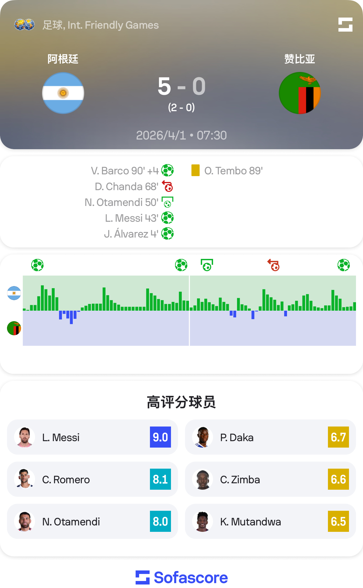 凭借阿尔瓦雷斯、梅西、奥塔门迪(点球)、巴尔科的进球,阿根廷5比0战胜赞比亚,梅