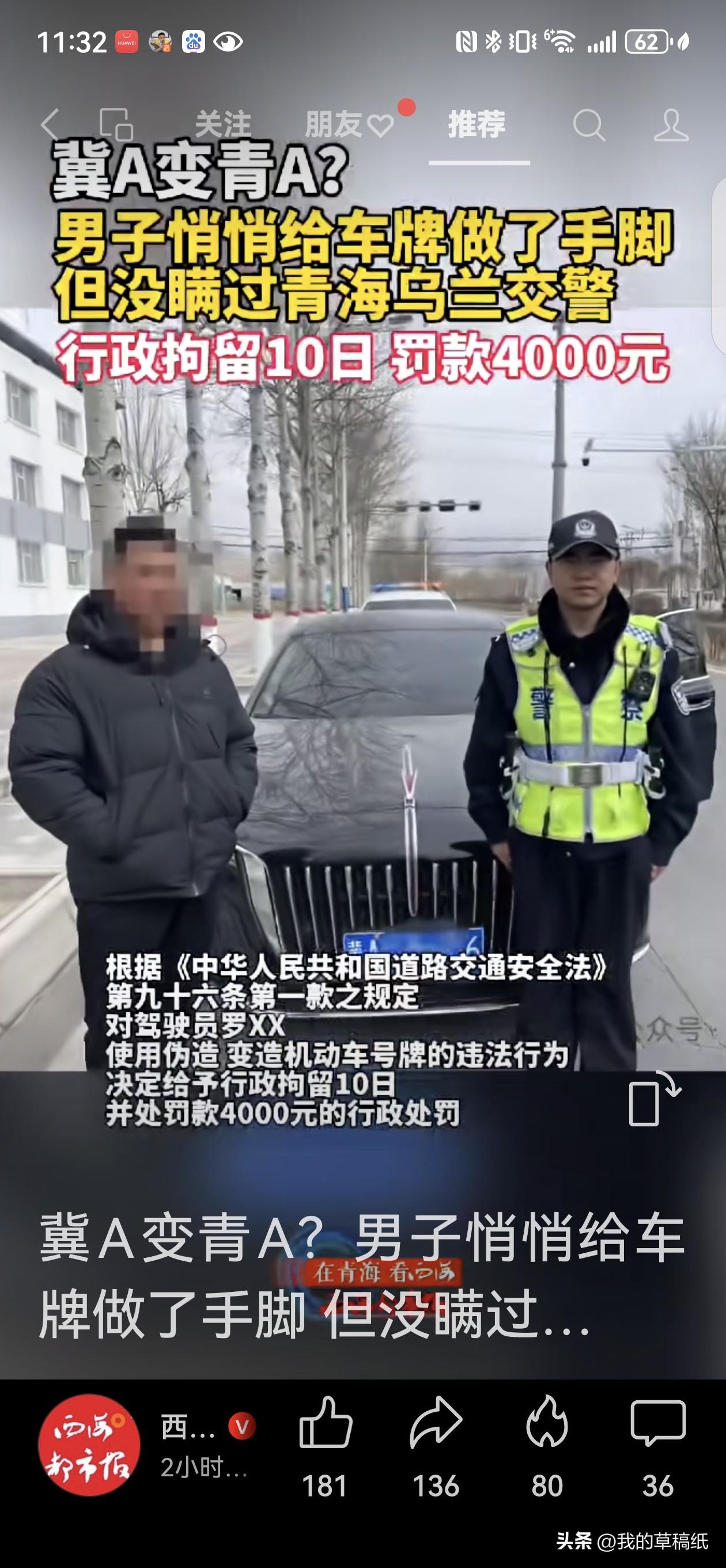 “冀A”变“青A”,这个“聪明”司机12分扣完人进局子! 青海乌兰交警这次查获的“变脸”操作,真是让人哭笑不得!3月13日,在海西州G315国道上,罗某某开着冀A牌照的车,硬是把“冀”牌换掉,上了“青”牌,企图蒙混过关。结果呢?行政拘留10日,罚款4000元,还喜提全网通报“露脸”! 很多跑长途的司机都懂,出门在外想省点过路费、躲个电子眼,但这点“小聪明”恰恰是最大的糊涂!你以为换个车牌就能瞒天过海,殊不知一上路就进了交警的“大数据天网”。 伪造、变造号牌,不仅是对交通法规的藐视,更是对公共安全的不负责任——真出了事故,你让被套牌的车主怎么背锅?让受害者找谁去? 这4000块罚款加10天拘留,足够买多少趟合法过路费了?侥幸心理,往往是通往事故和拘留所的捷径。守法行车,才是对自己和家庭最大的负责。 罗某某这个“反面教材”,希望能给所有爱动歪脑筋的司机提个醒:车牌不是玩具,法律更没有漏洞可钻! 分享今日的人生感悟 春日生活打卡季
