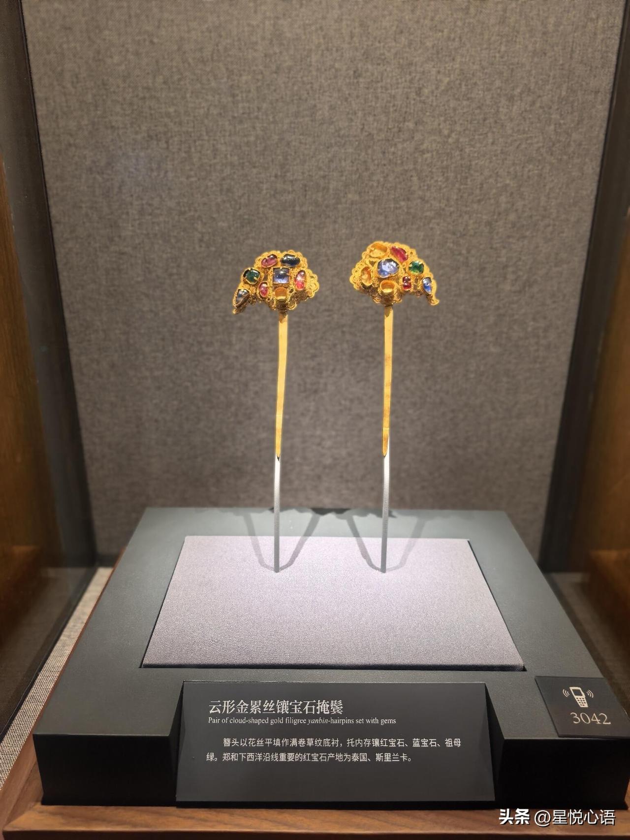 湖北省博的梁庄王珍藏, 看一眼就沦陷。 云形金累丝镶宝石掩鬓, 金镶宝石簪、各式金饰, 花丝精巧,宝石璀璨。 红宝、蓝宝、祖母绿, 不少都来自郑和下西洋沿线。 金器镶宝、嵌玉雕花, 件件都是顶级工艺。 梁庄王的偏爱, 全藏在这些珠光宝气里。 不只是奢华, 更是藏在细节里的温柔。 古人的浪漫, 真的太拿得出手了。