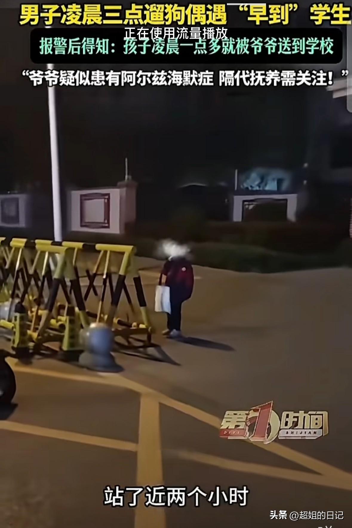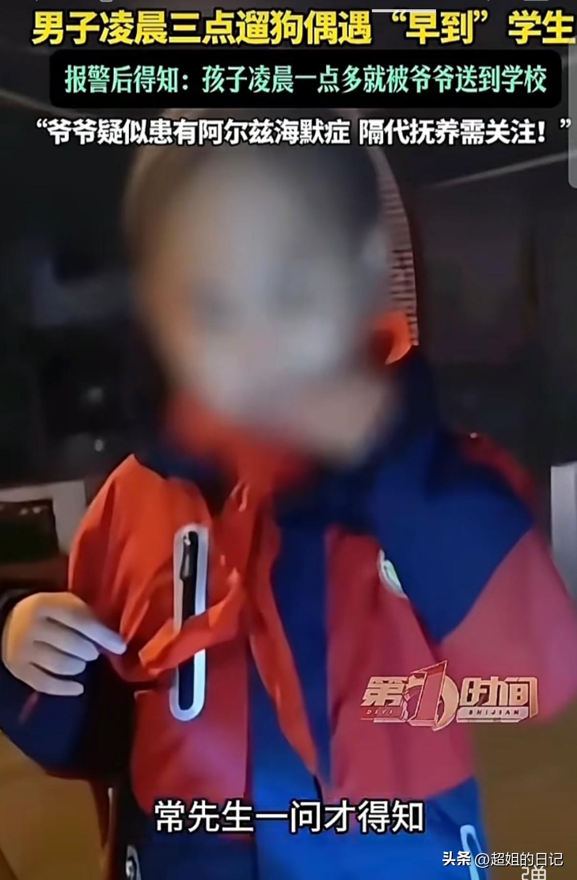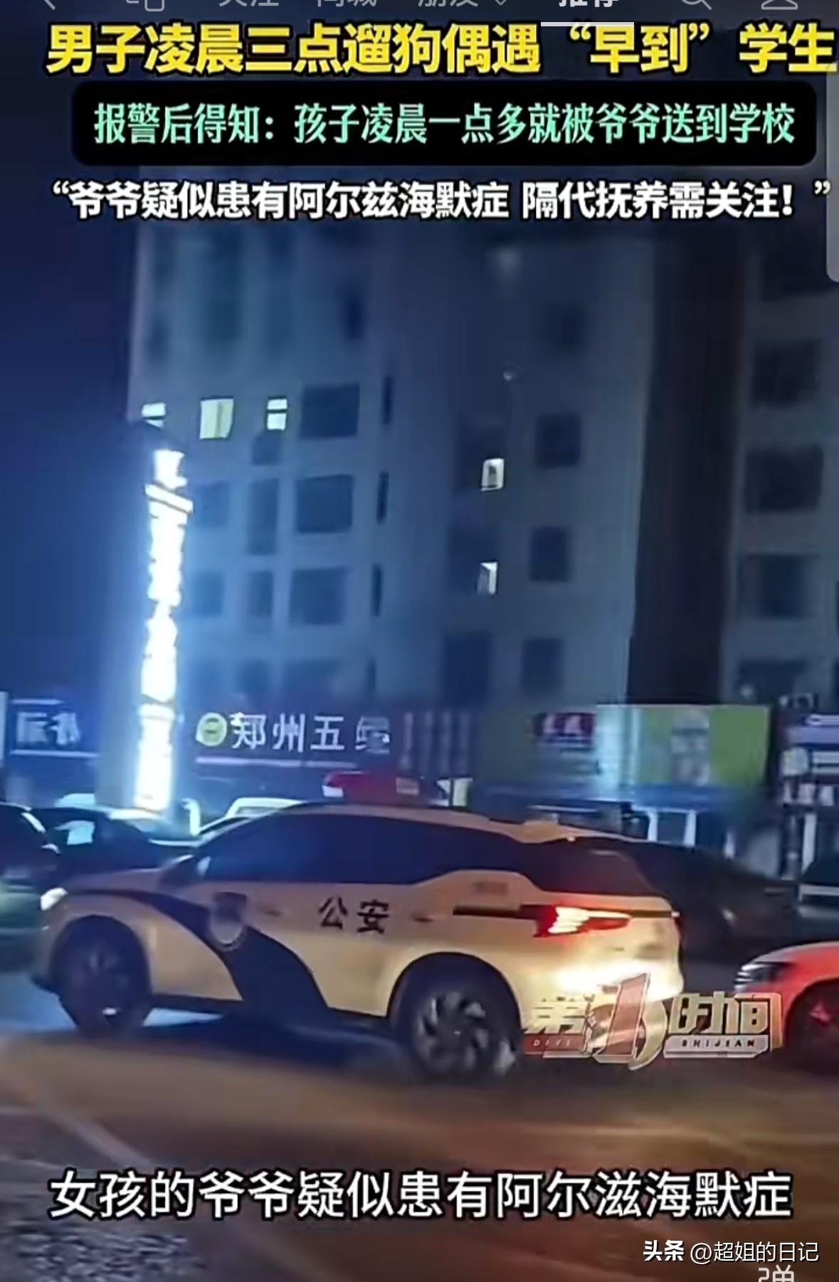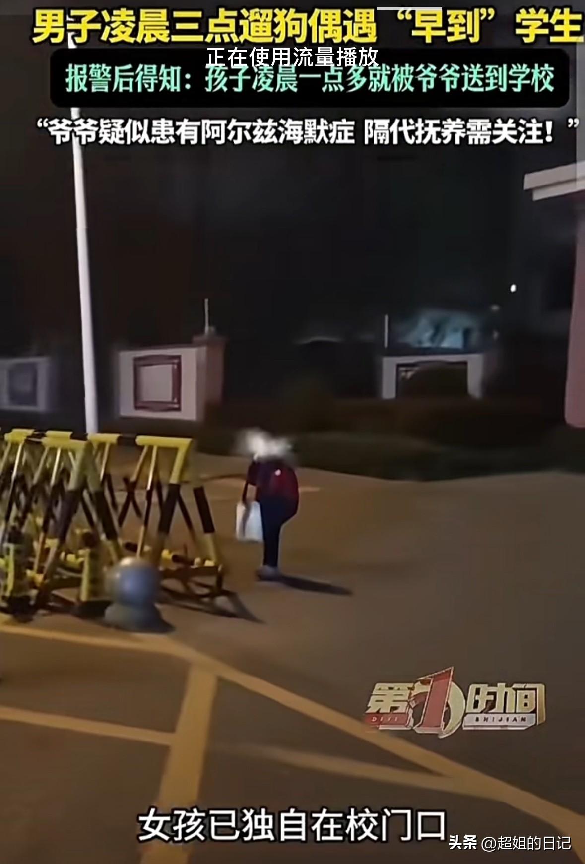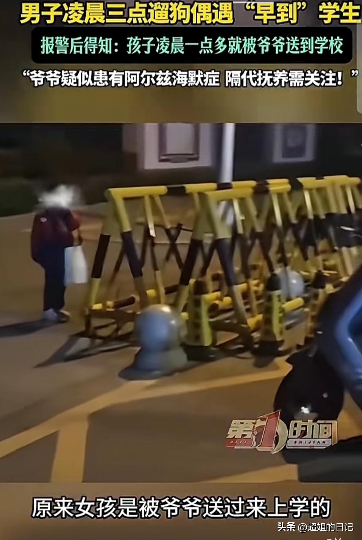 小女孩儿才8岁左右,凌晨1点40被爷爷送到学校门口准备上学。3点多,女孩儿被一溜狗大哥发现后,联系女孩儿得爷爷,电话接通后,发现跟女孩儿的爷爷无法正常交流,无奈选择了报jing 。 后来经过了解得知,女孩儿得爷爷因为患有阿尔默兹海默症,女孩儿是爷爷平时在照顾,爷爷也是好心,女孩儿也太小,所以才出现了这样的问题。被发现时,女孩儿已经独自在学校门口站了两个小时。 可怜的孩子,为什么要让爷爷照顾,父母在干嘛呢。而且,自己父亲已经这样,根本没有能力照顾孙女了。 两个需要照顾的人,互相照顾,想想都可怜,希望孩子的父母,能多关心家里老人的身体状况,抽出时间照顾好自己的女儿。