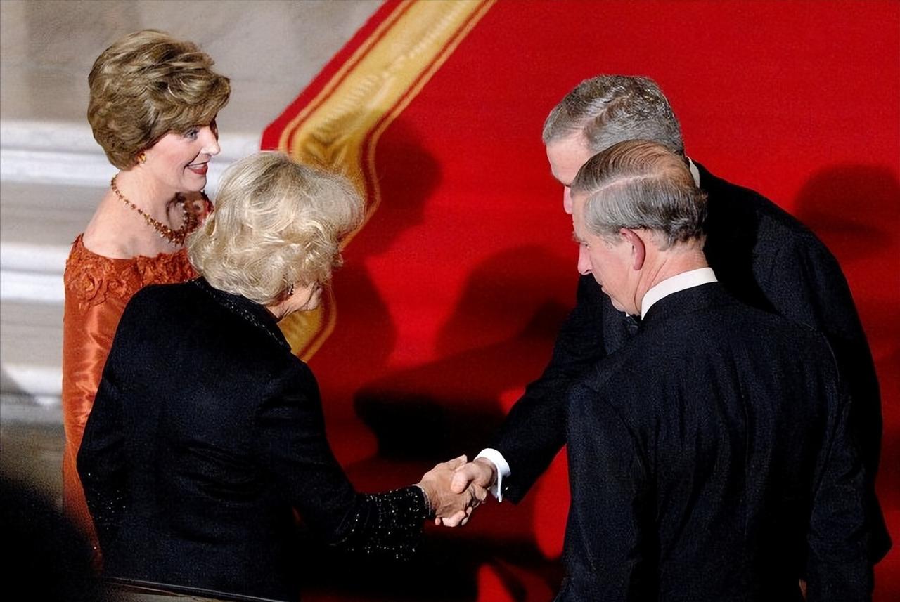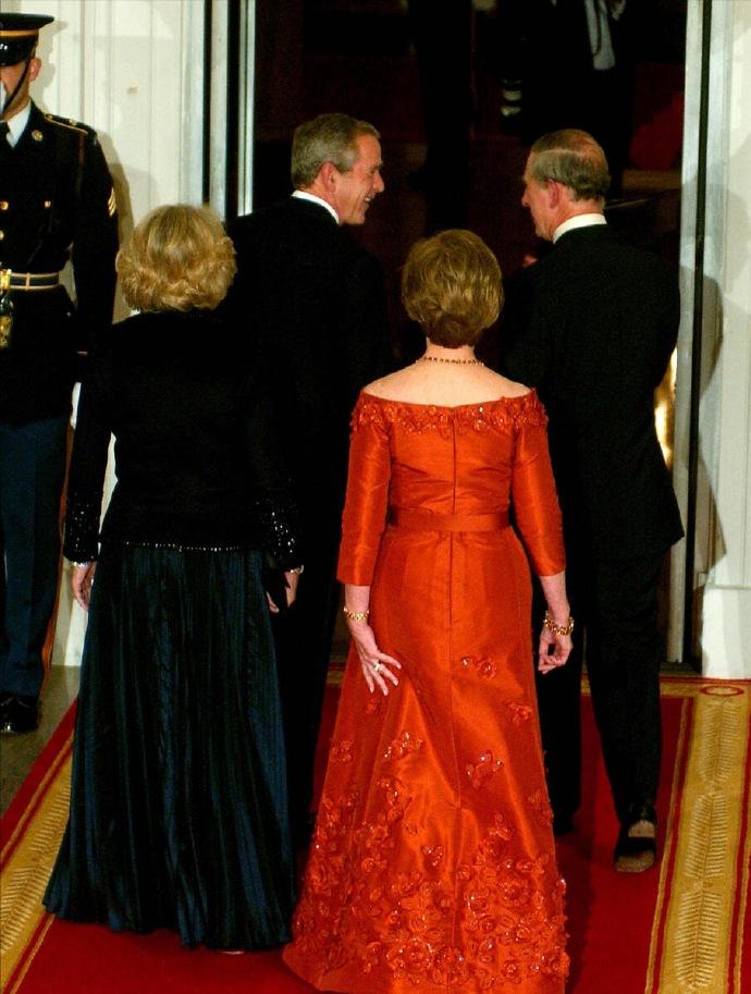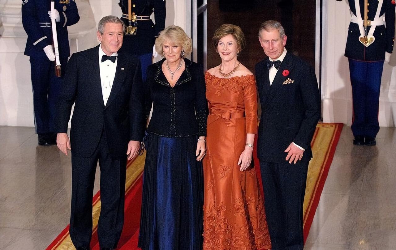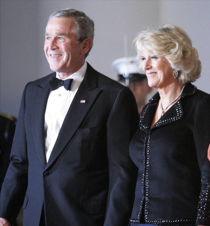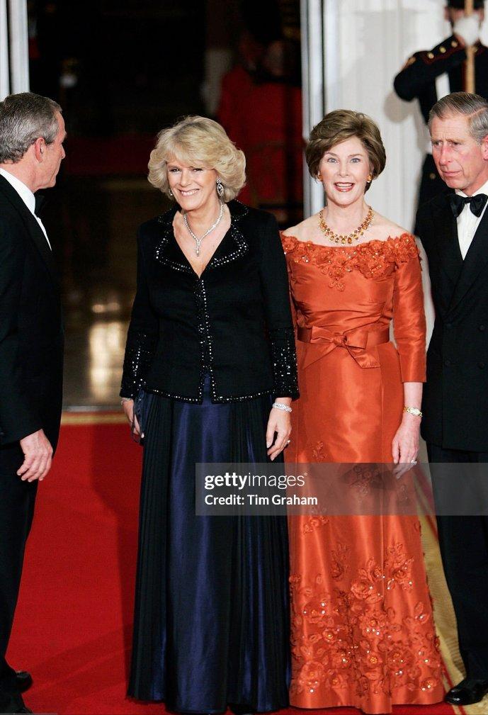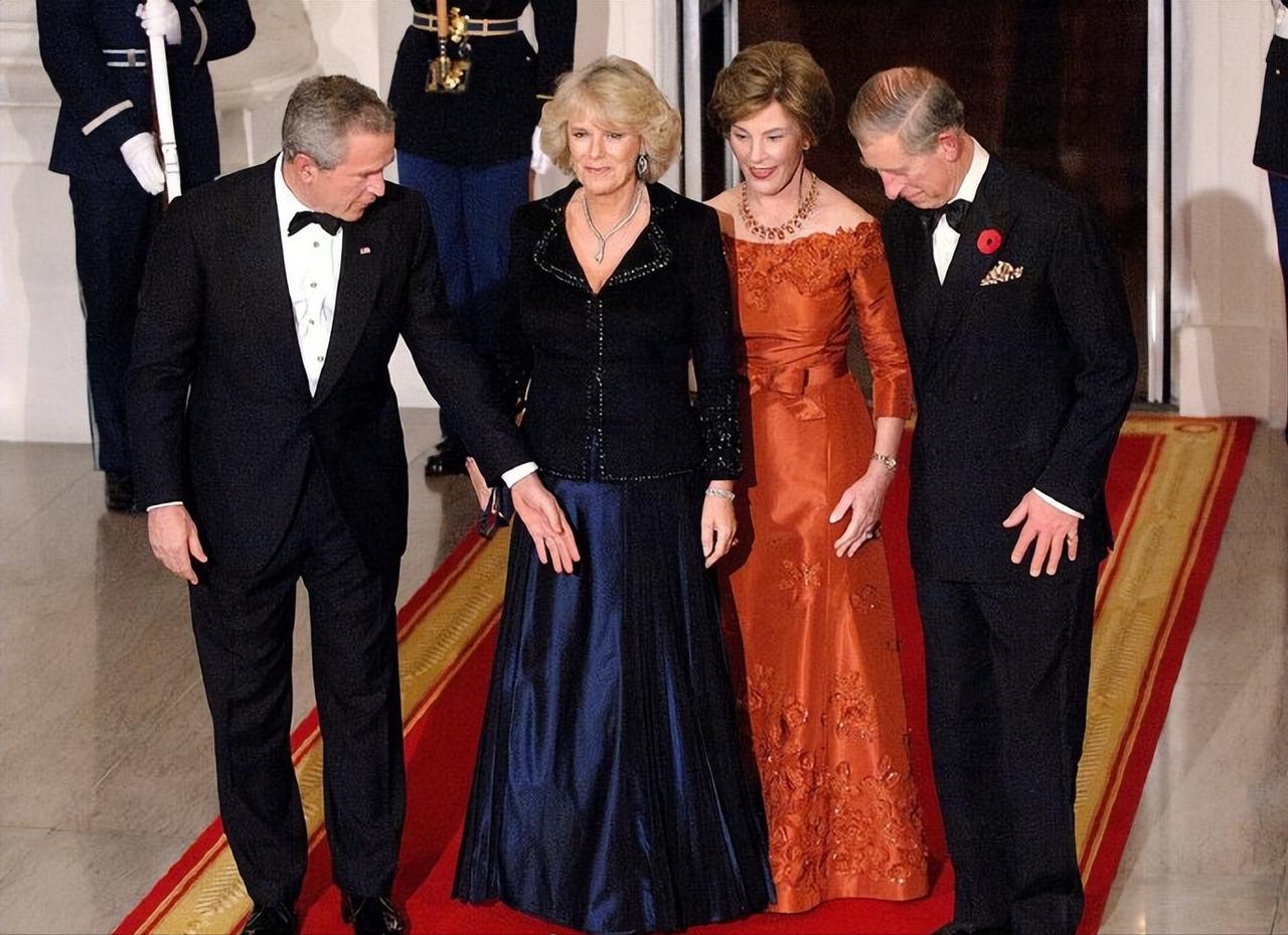 2005年11月2日,威尔士亲王查尔斯王储和妻子康沃尔公爵夫人卡米拉盛装亮相,一同在白宫参加晚宴。 这对王储夫妇纠纠缠缠多年,终于在年过半百之际成功迈入婚姻的殿堂。 2005年,两人大婚,威廉王子和哈里王子陪着父亲查尔斯一同迎娶继母卡米拉。 这次出访,也是查尔斯和新婚妻子卡米拉的首次海外访问。 作为康沃尔公爵夫人,但是并不是威尔士王妃,首次出访,参加这样重要的晚宴。 卡米拉虽然也是贵族出身,还是王储夫人,但是对比同龄的第一夫人布什夫人,无论颜值,还是气质,亦或者衣品,卡米拉还是逊色不少。