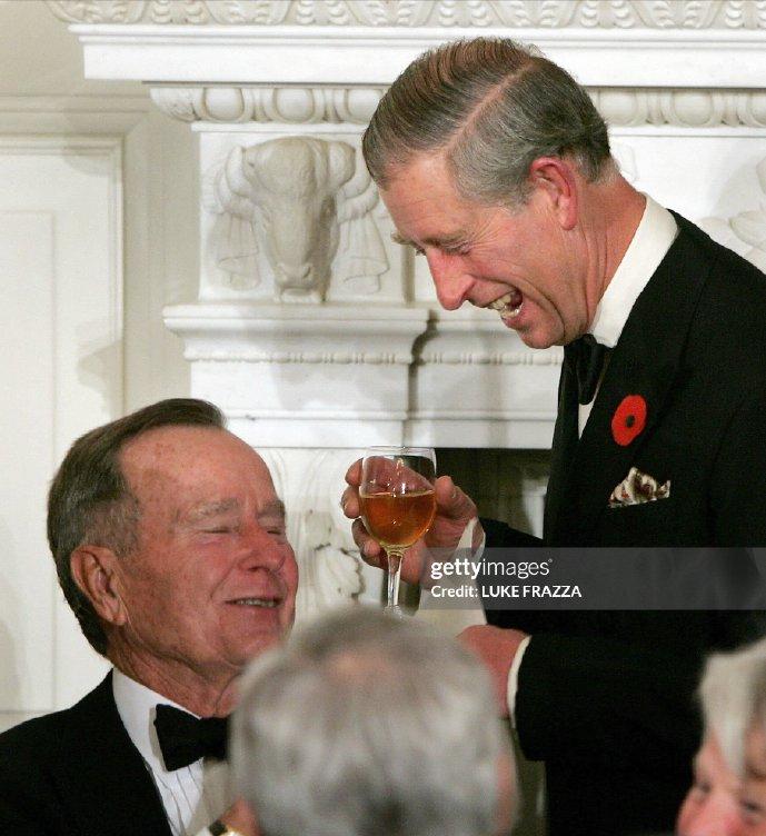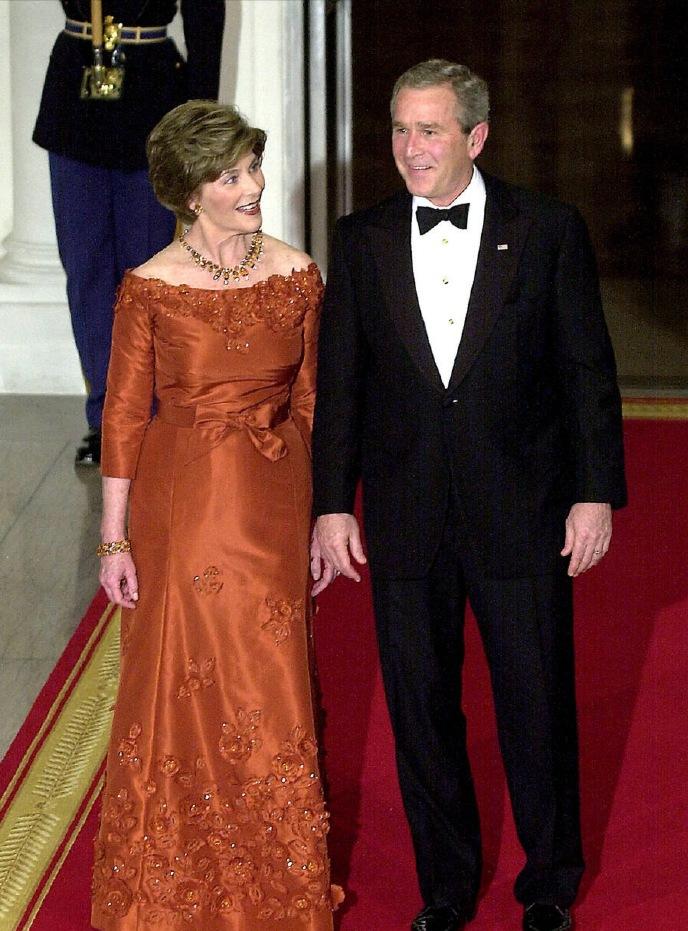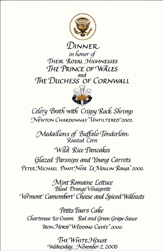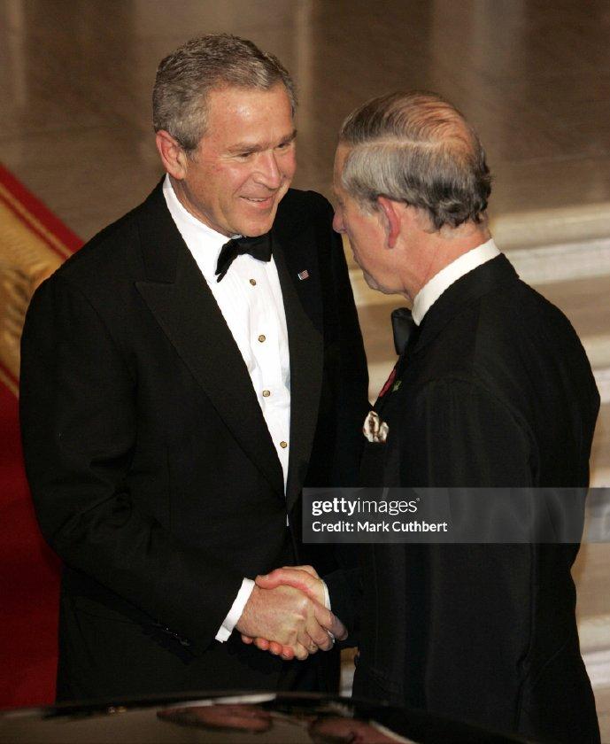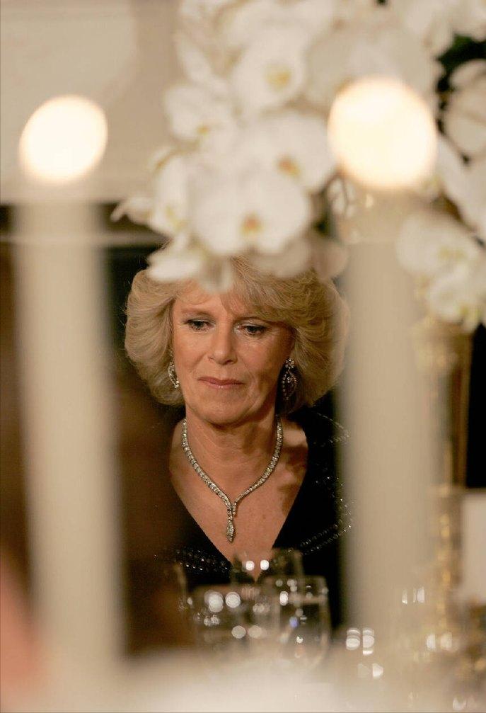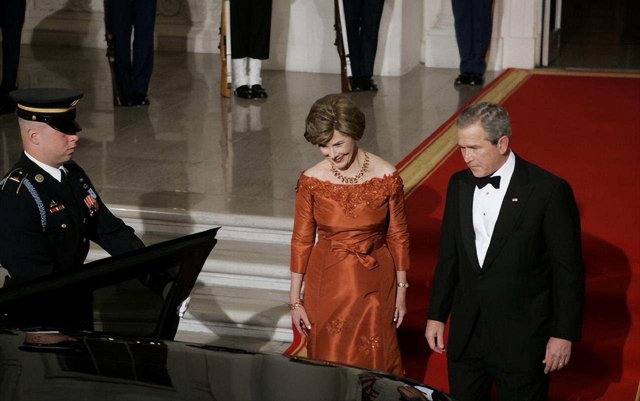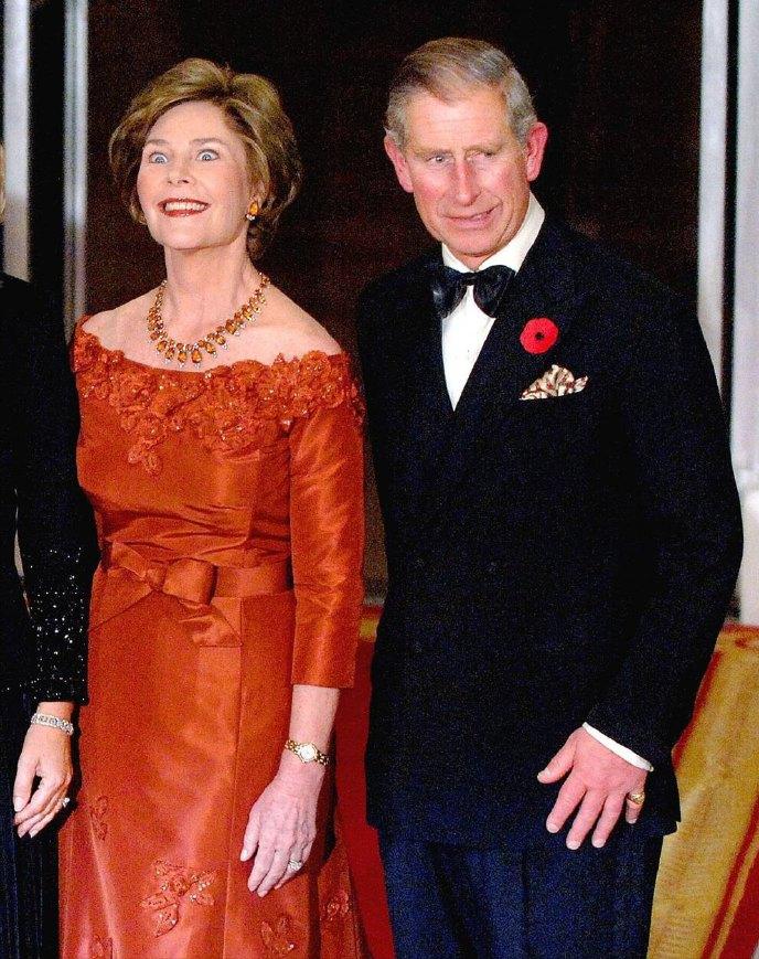 2005年11月2日,威尔士亲王查尔斯王储和妻子康沃尔公爵夫人卡米拉盛装亮相,一同在白宫参加晚宴。 这对王储夫妇纠纠缠缠多年,终于在年过半百之际成功迈入婚姻的殿堂。 2005年,两人大婚,威廉王子和哈里王子陪着父亲查尔斯一同迎娶继母卡米拉。 这次出访,也是查尔斯和新婚妻子卡米拉的首次海外访问。 作为康沃尔公爵夫人,但是并不是威尔士王妃,首次出访,参加这样重要的晚宴。 卡米拉虽然也是贵族出身,还是王储夫人,但是对比同龄的第一夫人布什夫人,无论颜值,还是气质,亦或者衣品,卡米拉还是逊色不少。