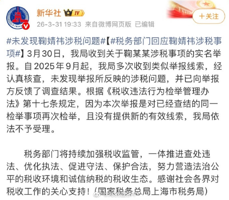 未发现鞠婧祎涉税问题 针对艺人鞠婧祎涉嫌偷逃税的网络举报一事,3月31日,上海市税务局稽查局发布情况通报,指出自2025年9月起,税务部门多次收到类似举报线索,经认真核查,未发现举报所反映的涉税问题!鞠婧祎粉丝如何说?