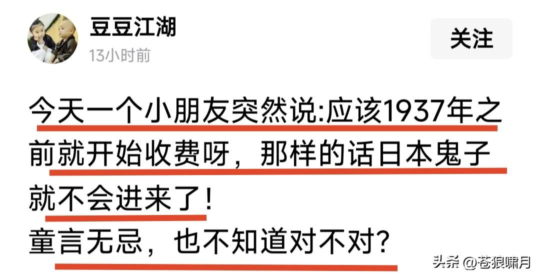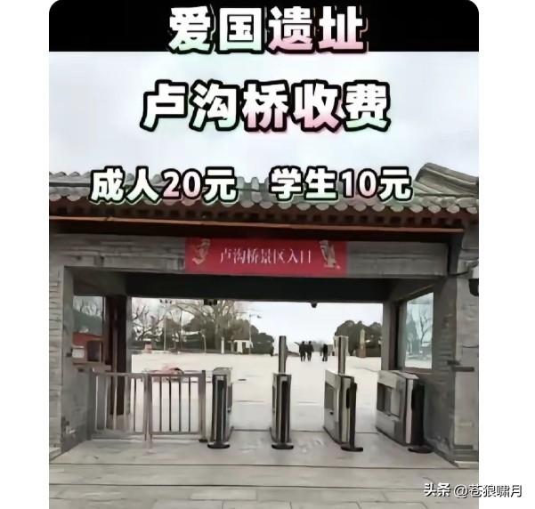 卢沟桥“景区”收费引争议!一小朋友质疑说:应该1937年前就收费,那样的话日本鬼子就不能进来了!网友评曰:童言无忌,不知孩子说的对不对? 我们都知道卢沟桥,是日寇正式入侵中国的开始!我们经常说的八年抗战,就是从1927年卢沟桥事变算起的!当然从9.18事变开始,就是抗战14年! 卢沟桥现在封闭,列为“风景区”管理,也是北京市被国家认定的“爱国教育基地”。问题是作为“爱国教育基地”,进门该不该收费?此事引发争议。 苍狼观点是:不管作为景区还是“爱国教育基地”,卢沟桥都需要管理维护! 这是一笔不小开支,国家可以包揽,但让游客掏一点,也激发爱国情怀?何况成人20元儿童10元,等于近无嘛! …………