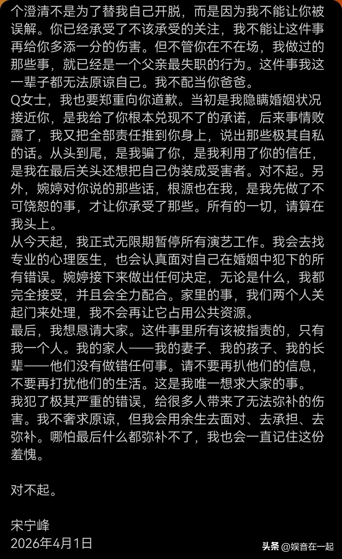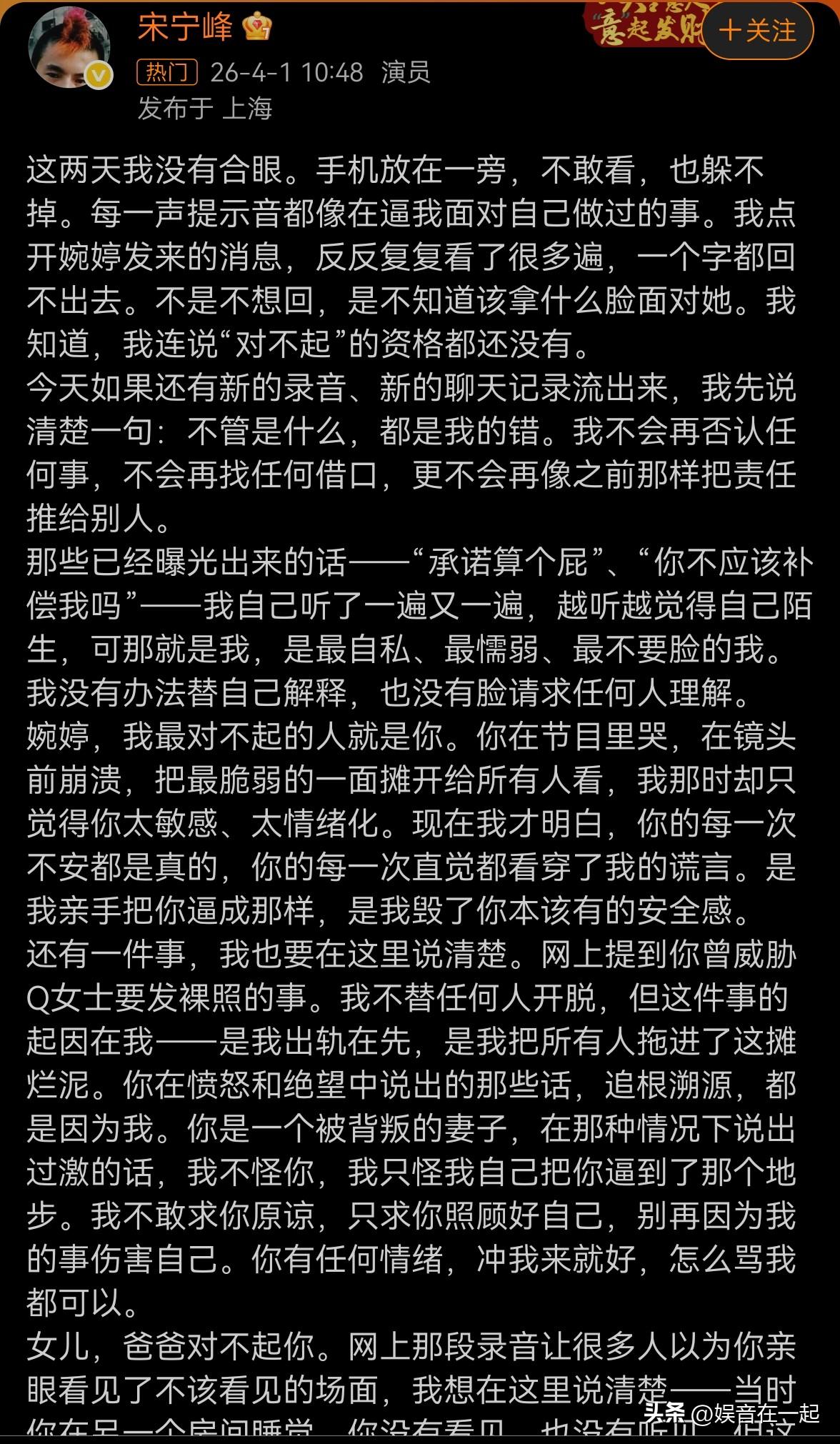 3月31日,“张婉婷老公宋宁峰被曝婚内出轨”上热搜。录音里他承认主动勾引第三者,还推卸责任,甚至被指带女儿私会。据网友爆料,他2025年1月与q女士酒局相识后发展婚外情,多次承诺离婚却没兑现。 4月1日,宋宁峰发长文道歉。他说不敢看手机,没脸面对张婉婷,不再否认和推诿责任。还提到张婉婷之前的不安和崩溃都是他造成的。他也说明了网上张婉婷威胁Q女士一事,起因是自己出轨。这波操作,不知能否得到大众原谅。