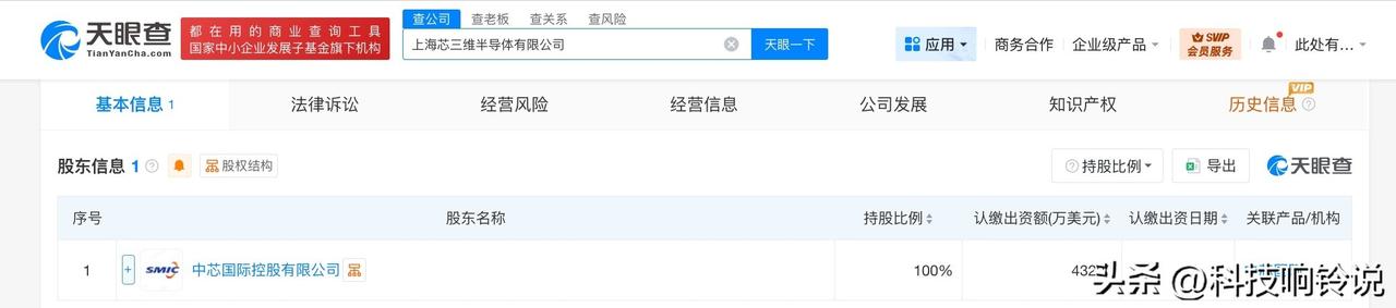 【中芯国际成立新半导体公司 注册资本4.32亿美元】 天眼查工商信息显示,近日,上海芯三维半导体有限公司成立,法定代表人为王永,注册资本4.32亿美元,经营范围包括集成电路制造、集成电路销售、集成电路芯片及产品制造、集成电路芯片及产品销售、货物进出口、技术进出口等。股东信息显示,该公司由中芯国际控股有限公司全资持股。 天眼查信息: