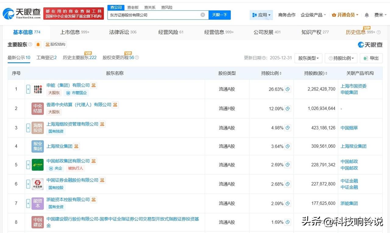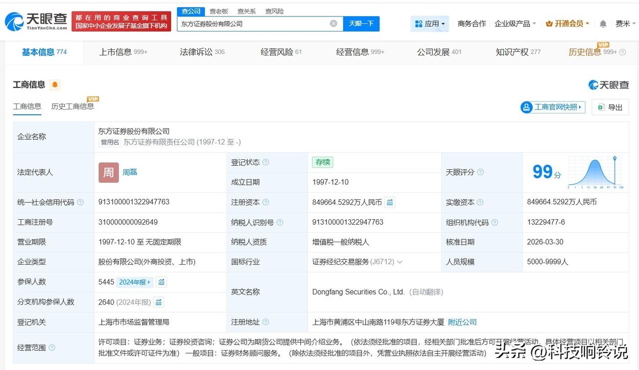 【周磊任东方证券董事长 东方证券换帅完成工商变更】 天眼查App显示,近日,东方证券(600958)发生工商变更,龚德雄卸任法定代表人、董事长,由周磊接任。 东方证券股份有限公司成立于1997年12月,注册资本约84.97亿人民币,经营范围包括证券业务、证券投资咨询、证券公司为期货公司提供中间介绍业务等,由申能(集团)有限公司、香港中央结算(代理人)有限公司、上海海烟投资管理有限公司等共同持股。 据媒体报道,此前,东方证券发布公告称,周磊被选举为公司董事长。 天眼查信息: