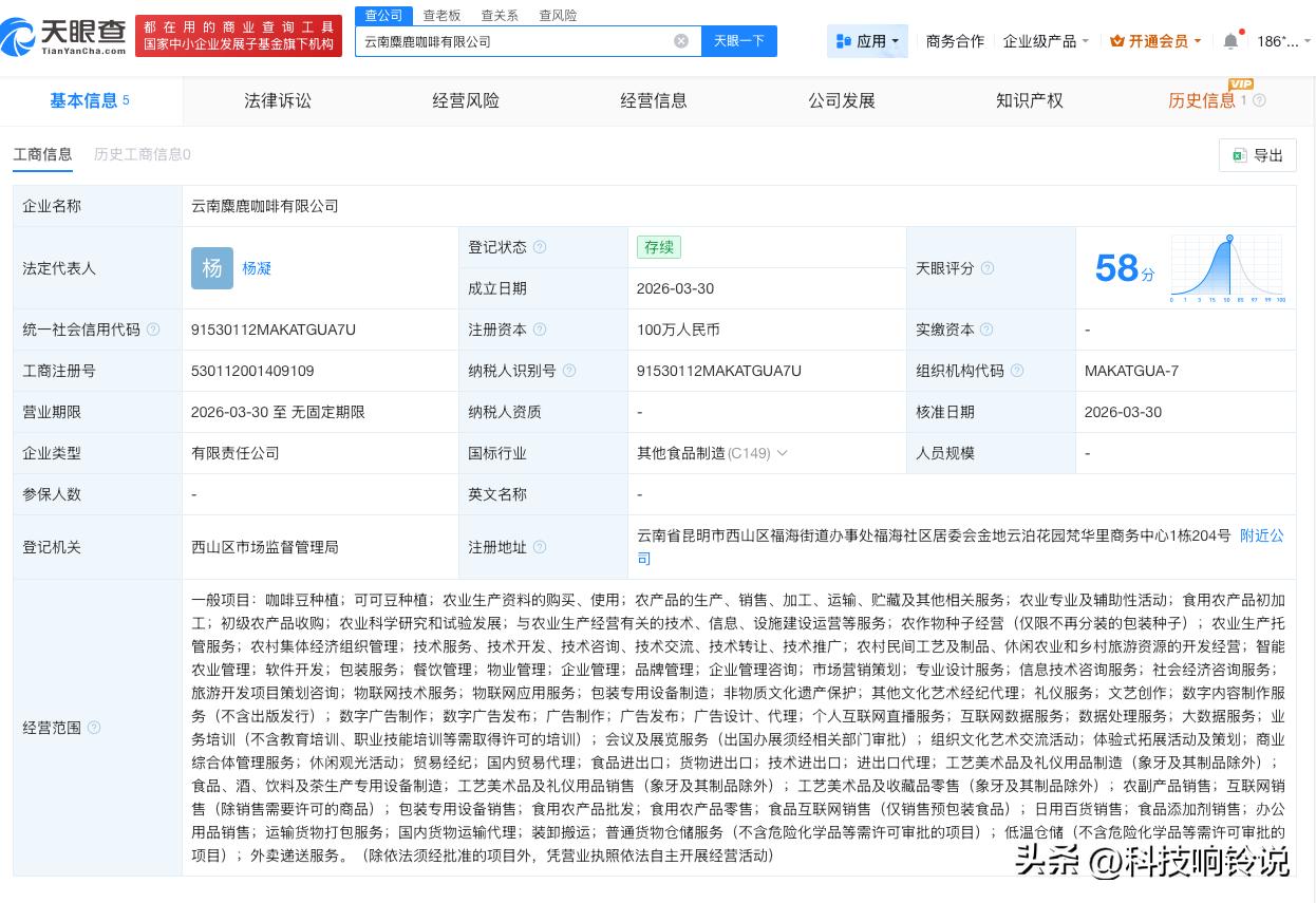【李亚鹏成立麋鹿咖啡公司 李亚鹏名下公司成立新公司】 天眼查工商信息显示,近日,云南麋鹿咖啡有限公司成立,法定代表人为杨凝,注册资本100万人民币,经营范围包括咖啡豆种植、食用农产品批发、食用农产品零售、食品互联网销售等。股权全景穿透图显示,该公司由李亚鹏名下北京艺莲文化科技有限公司、罗毓藻分别持股90%、10%。 天眼查信息: