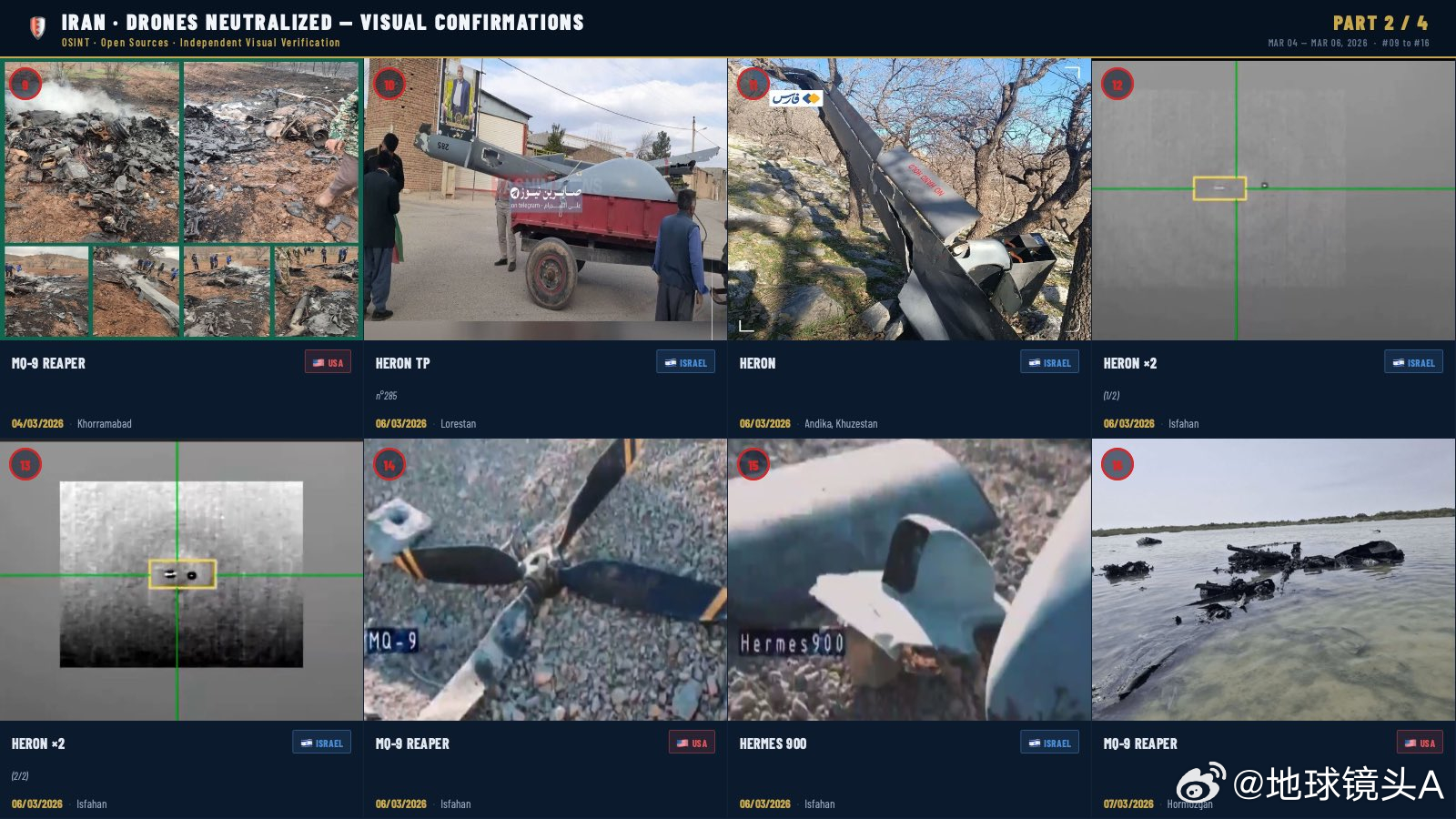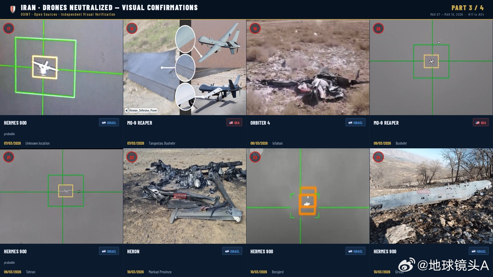 据彭博社在 3月19日援引美国官员消息,此次冲突中美国损失的 12 架 MQ-9 “死神” 无人机里,有 9 架被伊朗击落。伊朗伊斯兰革命卫队称已摧毁约 20 架 MQ-9 无人机,各类无人机共140架。该数字尚未经独立渠道证实。本帖所列40起案例,均得到截至目前已公开的影像证实。