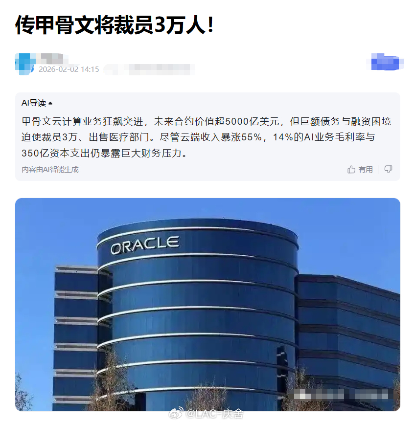 都在说甲骨文凌晨6点突发裁员3万人 真实性未知;但是在2月份的时候就有传言曝光要裁员三万人(图1),是为了填补AI数据中心的缺口。现在新闻都需要验证一下真实性才能看,一晚上裁3万人是不是夸张了点?