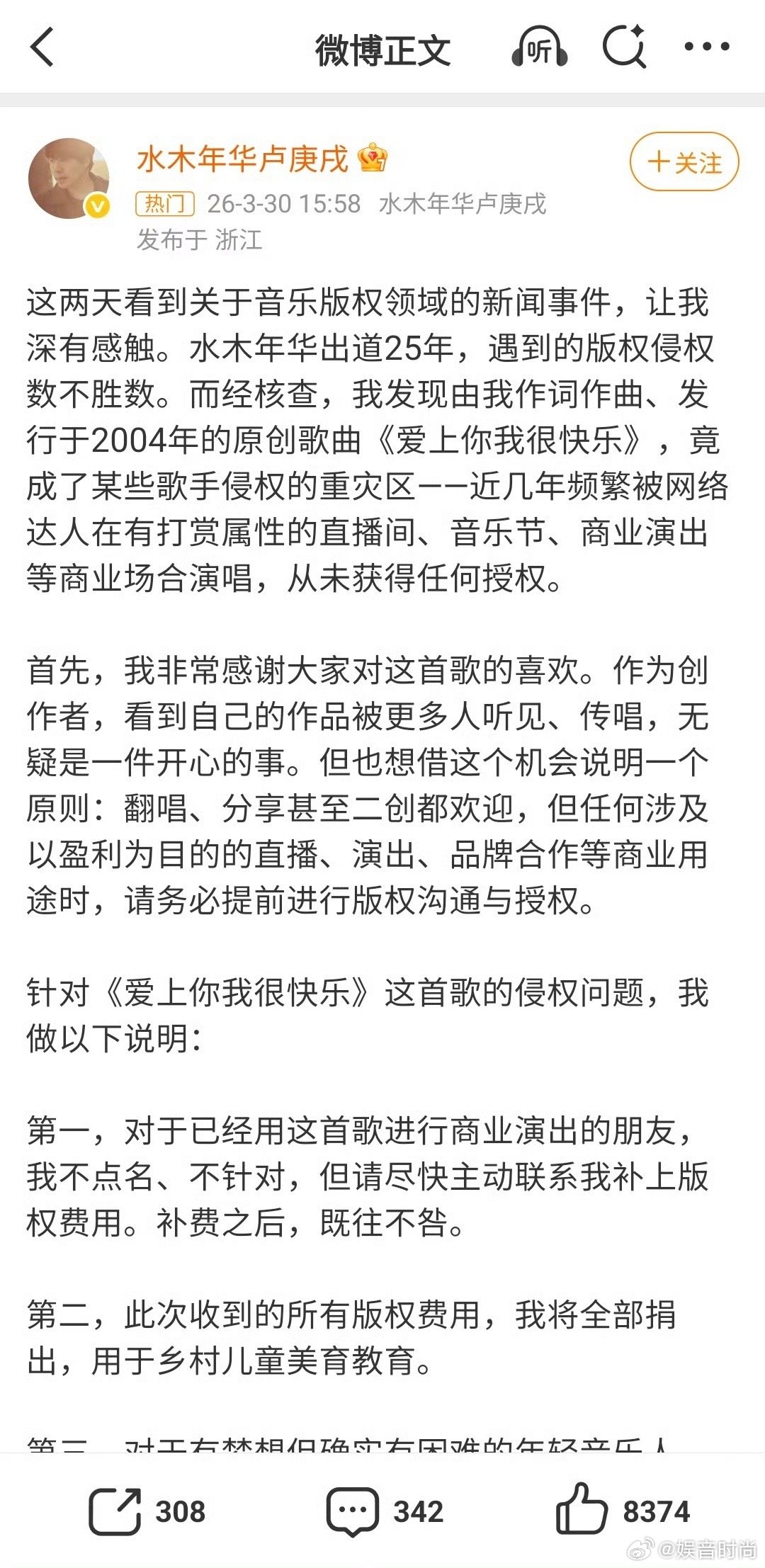 水木年华维权 一首传唱二十年的歌曲,背后是创作者持续的付出。卢庚戌此次公开维权,