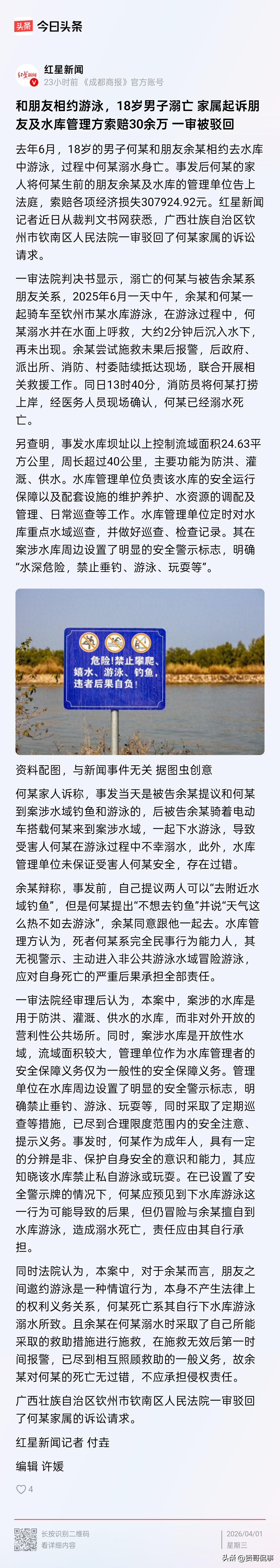 “不是谁死谁就有理!”广西钦州,因天气炎热,一男子在朋友的提议下,来到水库游泳,不曾想,刚下水不久,男子就突然溺水,朋友见状,立刻想办法施救,未果,男子最终还是溺亡了。之后,男子的家属认为,男子的溺水结果,应归咎于朋友的提议,及水库管理单位未保障男子的安全。于是,他们一纸诉状将男子的朋友及水库管理单位告上法院,索赔各项损失合计300000余元。 这是裁判文书网公布的一则真实案件。何某和余某是一对要好的朋友。 去年6月份的一天,因天气炎热,两人相约骑车来到当地一处水库准备游泳解暑。 两人下水后,在水中嬉戏打闹,好不快活。 可有些时候,意外总会来得猝不及防。在两人游泳过程中,何某突然脚抽筋,遭遇溺水险情,当即在水面大声呼救。 余某见状,第一时间展开施救,拼尽全力尝试将好友救上岸,但受限于自身能力与水下复杂环境,最终施救未果。 何某在挣扎两分钟后,还是从水面上彻底沉了下去。 余某慌乱之余也拨打了报警急救电话,但当消防员将何某打捞上岸时,经医护人员确认,其已经身亡。 好好的人出门,回来却是一副冰冷的尸体,这样的打击让何某家人难以承受。 悲痛之下,家属将同行好友余某、水库管理单位一同诉至法院,索赔各项损失合计30万余元。 何某的家属认为,去水库是余某最先提议的,还搭载何某前往,最终导致何某溺水;同时水库管理方也没有切实保障何某的人身安全,两方都存在明显过错,理应承担赔偿责任。 对此,余某则有另一番说法,表示自己最初只是提议钓鱼,而并非主动邀约游泳,是何某主动提出要下水的;不仅如此,事发后,自己也全力对他进行施救过,救不成才又立刻报警,已经做了朋友能做的一切。 水库管理单位反驳道:水库库区属于公益水利场地,并不是经营性公共场所。 此外,全域也早已设置了禁止游泳的警示标牌,坚持常态化巡查履职,水库管理单位完全尽到了管理和提醒义务。 何某作为成年人,之所以溺亡,原因在于他本人无视警示擅自下水,最终酿成的后果也应由其自己承担,水库管理单位不应赔偿。 1、根据《民法典》1198条规定,安全保障义务主要针对宾馆、商场、娱乐场所等经营、公共场所。 本案中,案涉水库属于公益性水利设施,并不是是对外开放的营利场所,所以,对于水库管理方而言,仅负一般的保障义务。 从水库管理方的做法来看,水库管理单位已经在水库周围设置了警示标志,并定期进行巡查,尽到相应的义务。 对于何某的溺亡结果,再让其承担责任,无疑是强人所难。 2、至于朋友余某,即便事实上是他邀约何某去游泳,这也是朋友之间正常的情谊行为,没有任何问题。 而且,在何某溺水后,余某在能力范围内已经尽到了相应的救助义务。 余某也不应承担任何责任。 3、何某本人应当为自己的溺亡结果负全责。 何某作为一名具有完全民事行为能力的成年人,即便接受余某的邀约,他也应当知晓擅自下水库游泳可能面临的风险。 基于此,他仍然而为之,当然要为此承担不利的后果。 据此,法院最终也驳回了何某家属的全部诉求。 虽然在情理上,我们同情家属白发人送黑发人的悲痛与心酸,但从法理上来讲,并非谁死谁就有理,法理从不偏袒悲情,承担责任与否只看过错。 作为成年人,明知水库禁止游泳,却依然选择冒险,酿下如此惨痛的后果,也只能由他自身承担,让人又能替他责怪谁呢? 对此,你怎么看?你身边发生过类似的事情吗?欢迎大家在评论区留言。(注:图片仅供示意)