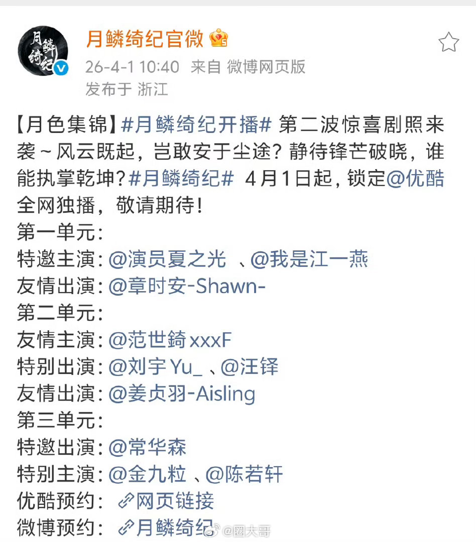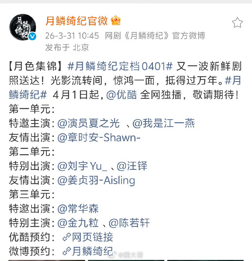 月鳞绮纪开播加了范世锜 看来是乌龙一场了,《月鳞绮纪》在开播前,就加了范世锜的名字,在被《月鳞绮纪》删了之后,范世锜工作室回应很是体面了,范世锜还转发了终极预告,诚意满满,这是打动了郭敬明导演啊!范世锜重回月鳞绮纪演员表