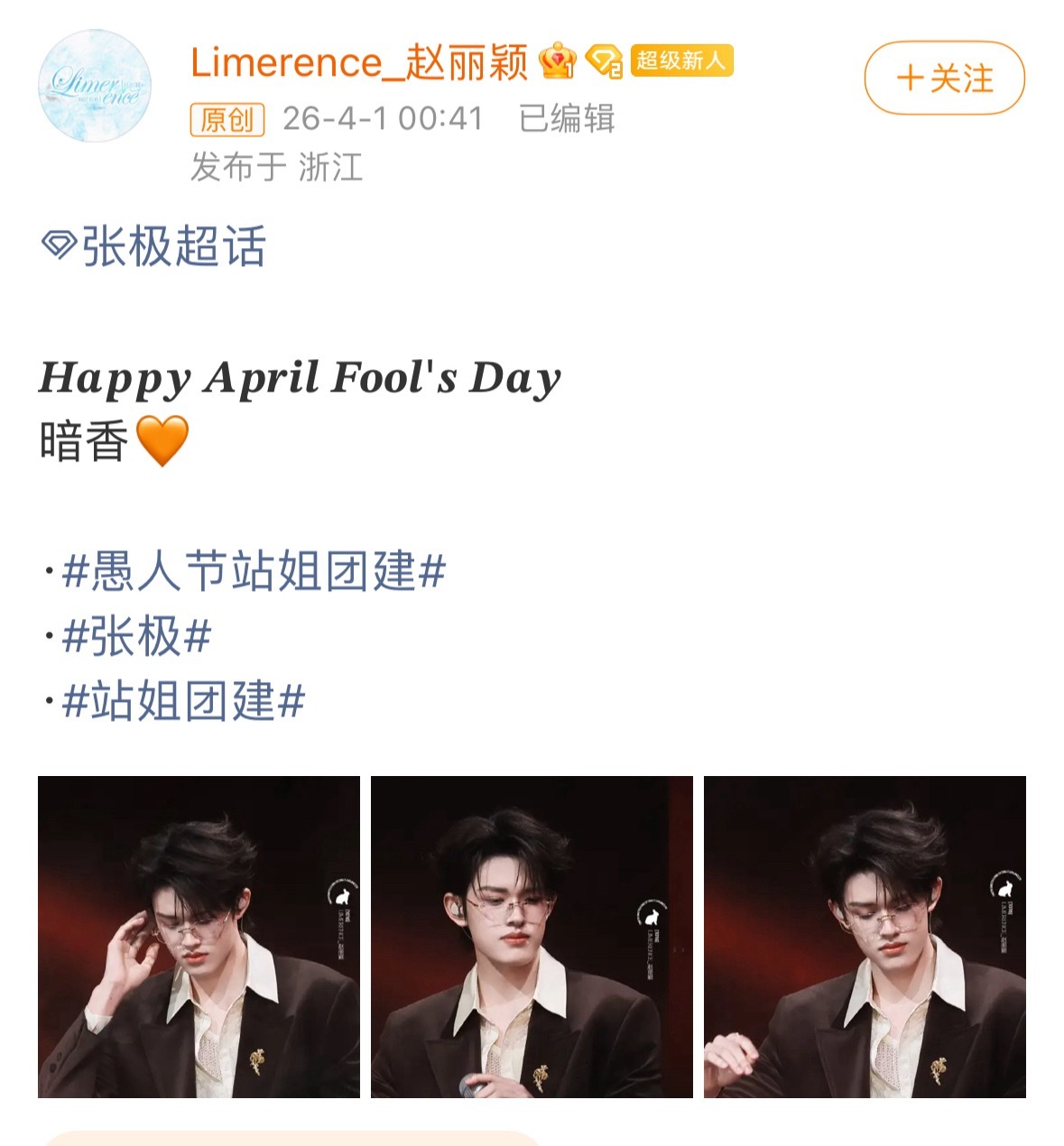 赵丽颖站姐发了top张极这组眼镜舞台真的好喜欢高智感“斯文败类”简直就是我的宿命❗️愚人节站姐团建