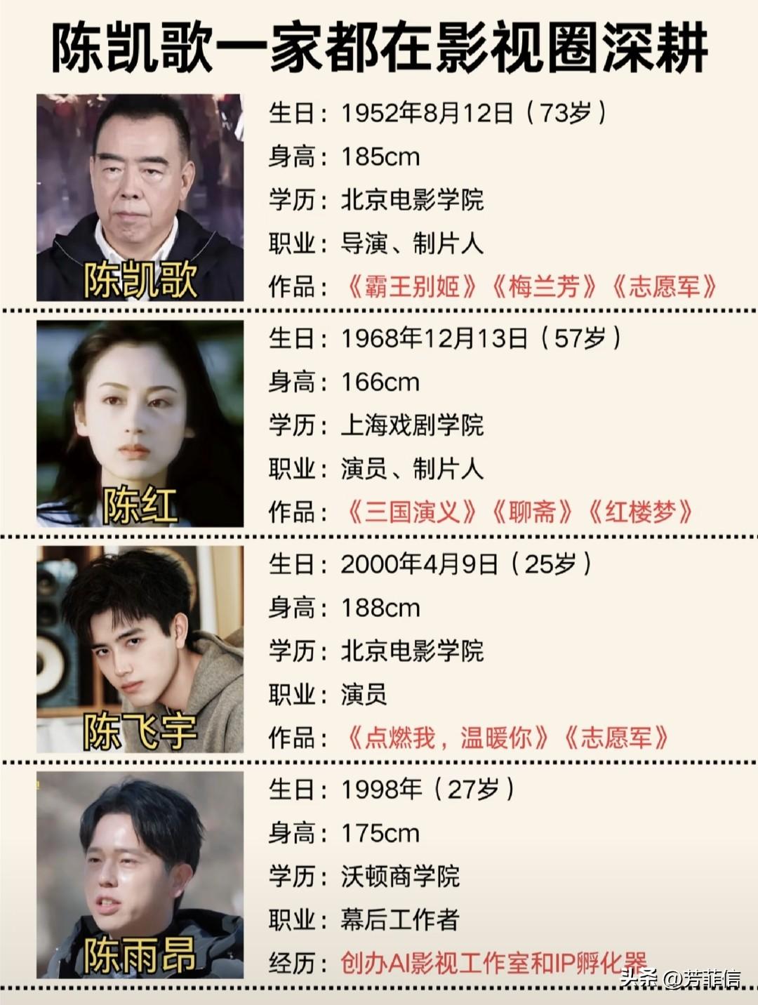 陈凯歌的基因还是太强大了…… 刷到陈飞宇的素颜视频,直接幻视他爹,从三白眼到凸嘴反颌,都和陈凯歌如出一辙,甚至连神态也一脉相承。 这复制粘贴的模子,两个儿子都逃不过,一边感慨丑基因的强大,一边又遗憾陈红美貌基因的埋没。 看到陈红,就想起那句唯有牡丹真国色,年轻那会是真惊艳啊,绝代佳人当如是,“大陆第一美人”的称号不是空穴来风。 如果找了帅哥,陈红的基因应该不至于浪费,可惜美女看才华不看脸,她要是个颜控就好了。 再盼陈红生小孩基本不可能,现在就希望陈红是隐形基因隔代遗传,且看陈飞宇的后代了。