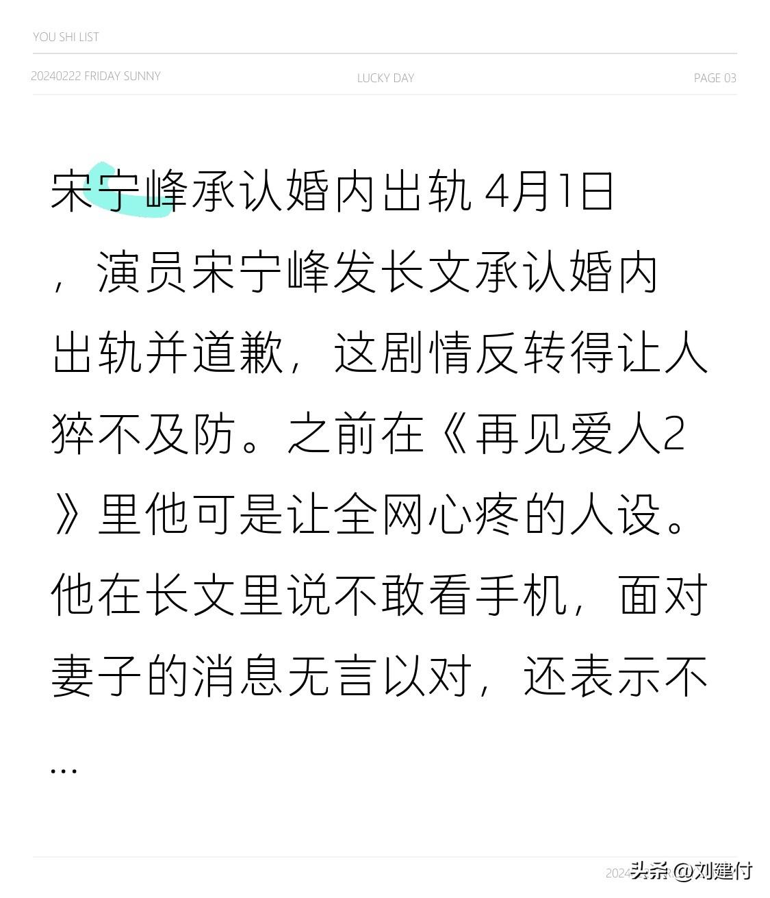 宋宁峰承认婚内出轨 4月1日,演员宋宁峰发长文承认婚内出轨并致歉,这剧情反转得令人措手不及。此前在《再见爱人2》里,他可是拥有让全网心疼的人设。 他在长文中称不敢看手机,面对妻子的消息无言以对,还表示不再否认、不找借口、不推卸责任。他意识到自己自私、懦弱且无耻,亲手摧毁了妻子的安全感。此外,他还承认网上提及妻子威胁他人一事,起因是自己出轨。 如今他无限期退圈,只能说娱乐圈的瓜一个接一个。从被心疼到人设崩塌,这落差着实不小,也让大家再次感叹,明星的事真是难以捉摸。
