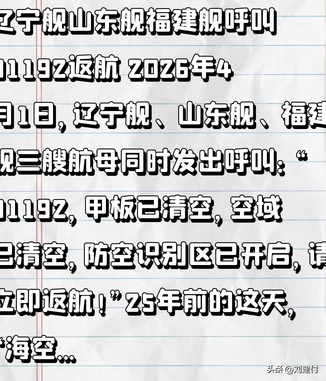 辽宁舰山东舰福建舰呼叫81192返航 辽宁舰、山东舰、福建舰呼叫81192返航 2026年4月1日,辽宁舰、山东舰、福建舰三艘航母同时发出呼叫:“81192,甲板清空,空域清空,防空识别区开启,请立即返航!” 25年前的这天,“海空卫士”王伟驾驶编号81192的战机拦截美军侦察机,被撞后跳伞坠海,壮烈牺牲。那时中国尚无航母,海空力量薄弱。 如今,从辽宁舰服役到福建舰入列,舰载机能从航母上起飞。王伟生前手绘的《夙愿》已然成真。这声呼叫,是对英雄的告慰,告知英雄他用生命捍卫的海空如今足够强大,他守护过的领空,由我们继续守护。 81192,不只是编号,更是时代的注脚。英雄,欢迎回家!