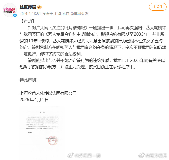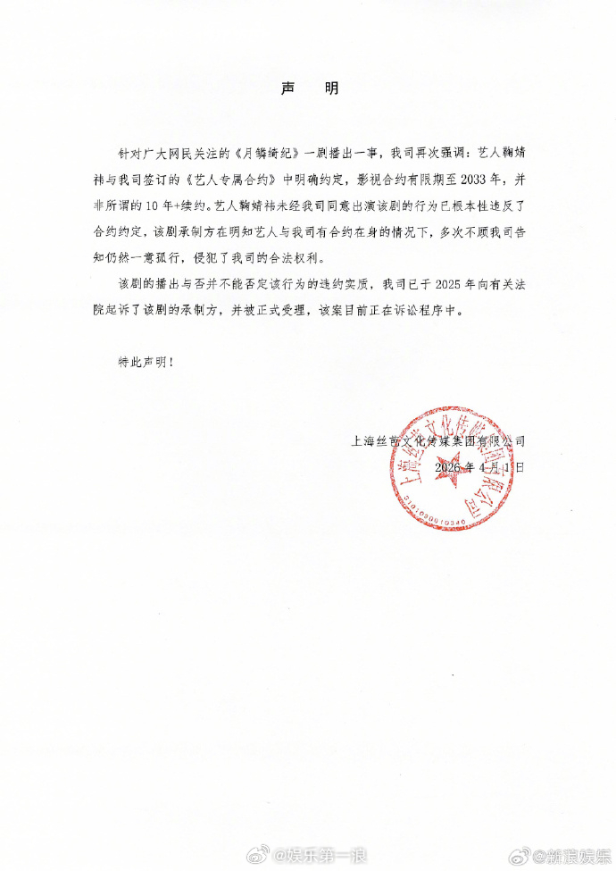 丝芭起诉月鳞绮纪承制方4月1日,发声明再次强调鞠婧祎与丝芭签订的《艺人专属合约》中明确约定,影视合约有限期至2033年。《月鳞绮纪》的播出与否并不能否定该行为的违约实质,丝芭已于2025年向有关法院起诉了该剧的承制方,并被正式受理,该案目前正在诉讼程序中。