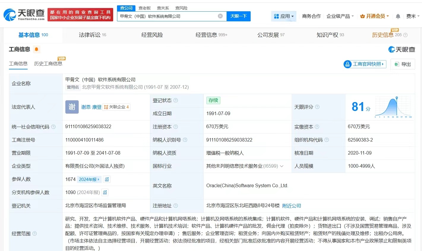 天眼查App显示,甲骨文(中国)软件系统有限公司成立于1991年7月,法定代表人为谢恩·康登,注册资本670万美元,经营范围包括研究、开发、生产计算机软件产品、硬件产品和计算机网络系统等,由甲骨文新加坡有限公司全资持股。法律诉讼信息显示,该公司曾因劳动争议、劳动合同纠纷等被起诉。