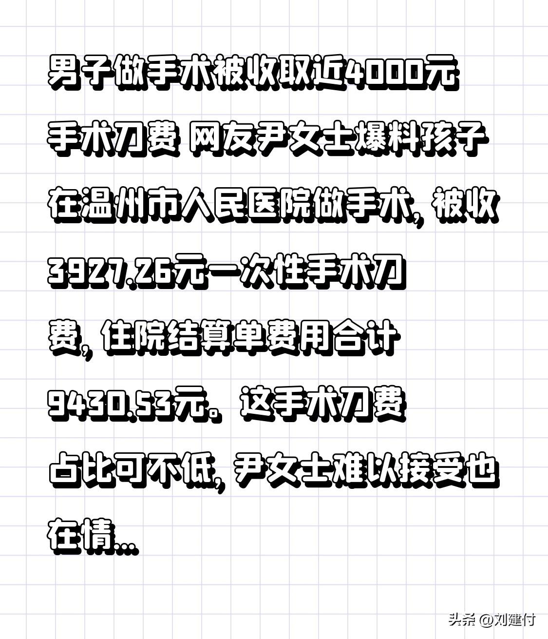 男子做手术被收取近4000元手术刀费 男子做手术被收近4000元手术刀费。网友尹女士爆料,孩子在温州市人民医院做手术,被收取3927.26元一次性手术刀费,住院结算单费用合计9430.53元。手术刀费占比颇高,尹女士难以接受也属正常。医院工作人员对此事要么不知情,要么电话无人接听,温州市卫健委也未给出进一步回应。 从法律规定看,医院术前应告知所有费用,保障患者知情权与选择权。但这家医院未提前告知就使用高额进口耗材,程序明显存在问题。虽然该病症所用进口刀具或许有医学价值,但不提前说明便收费,着实令人不悦。希望医院重视患者权益,规范收费程序。