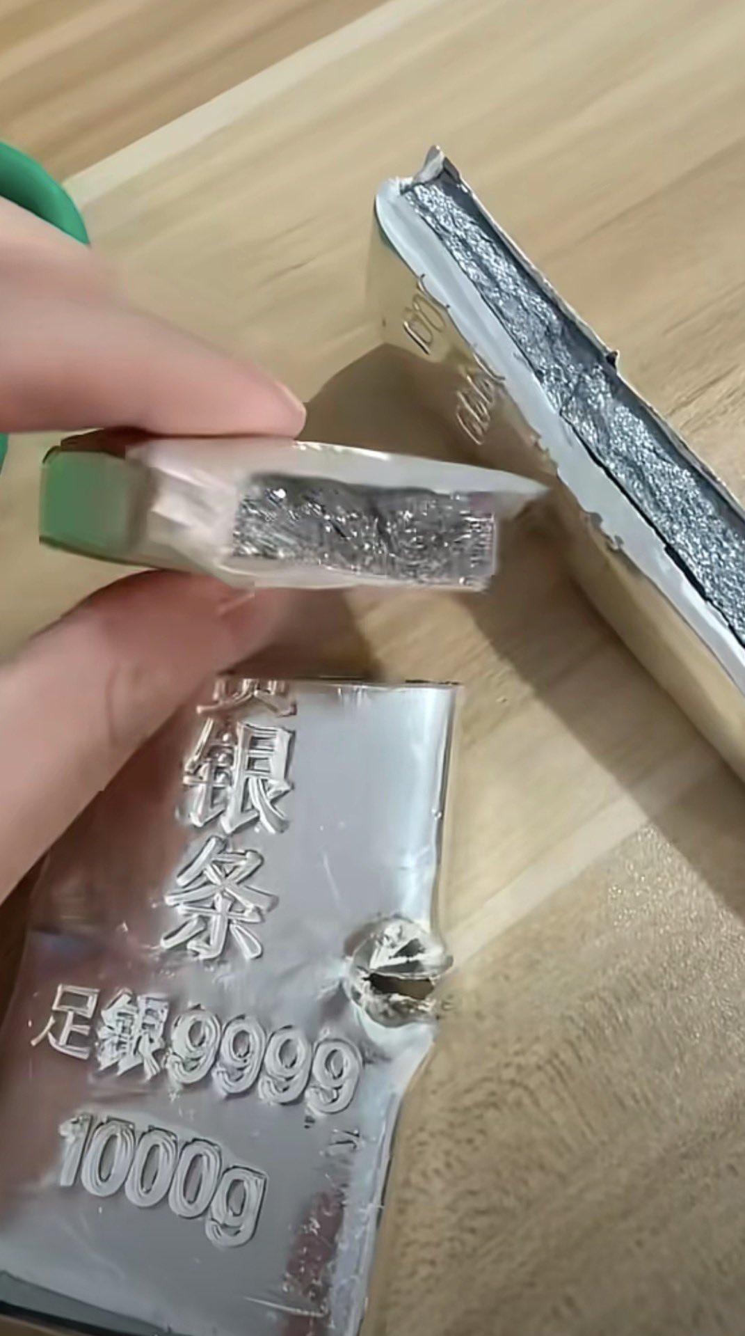 一位国内户分享了假冒的1000克投资银条的证据。这些银条在包装、标记甚至光谱检测方面都与真品如出一辙,但其内部却是劣质的夹芯,只有切开后才能看到。 并在视频中演示了如何用剪刀切开一根贴有标签的银条,结果发现内部并非纯银,而是颜色较深、成分不均的其它金属。 还附上了类似切割后的金条照片。 这一事件再次提醒了广大投资买家要到正规的公司和银行去买卖,由于造假技术日趋先进,对金银条进行破坏性实物验证至关重要。