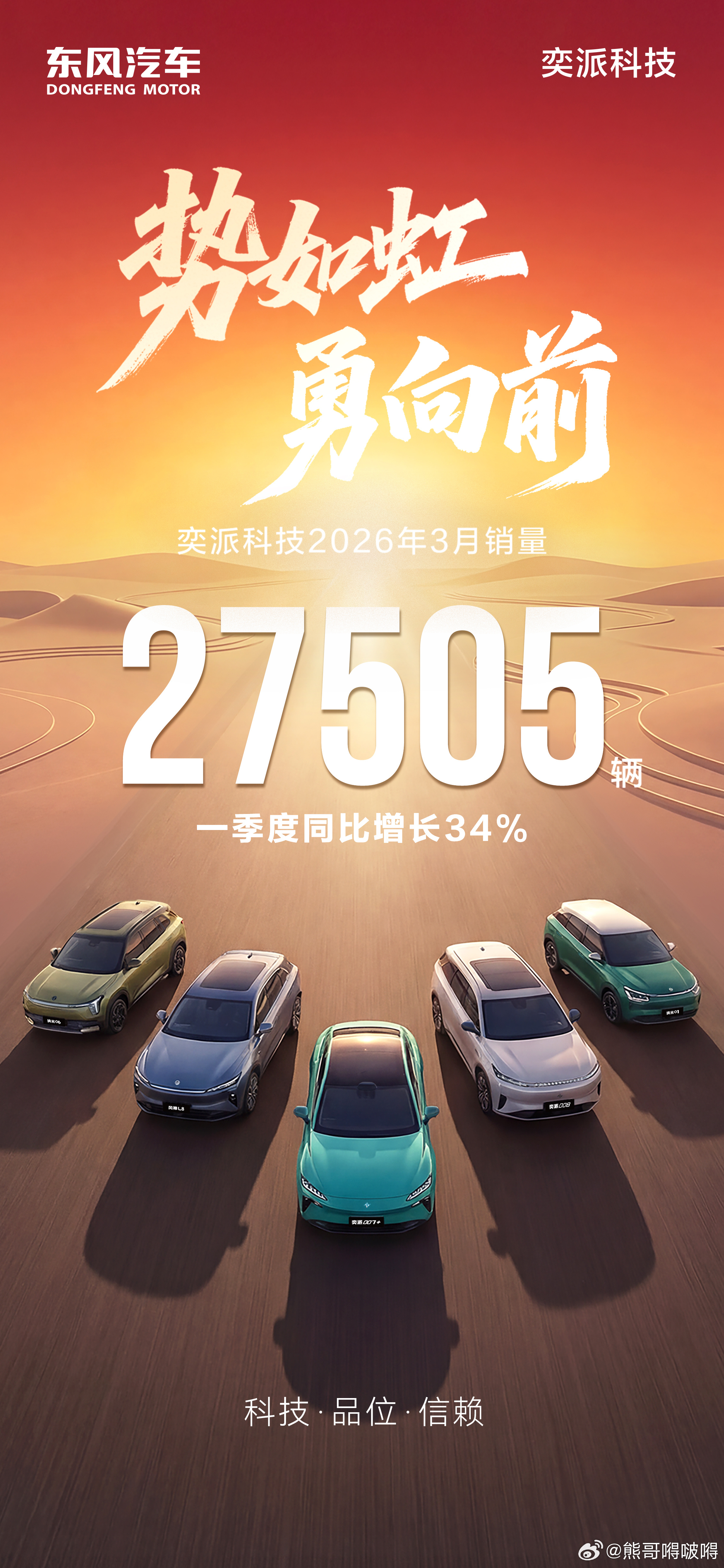 一季度,奕派科技以一份亮眼的成绩单跑赢大盘。3月交付27,505辆,同比增长30%;一季度累计交付63,659辆,同比增长34%,实现同比三连涨,展现出高质量发展的强劲势头。海外市场同样捷报频传,纳米01车型累计出口超3万辆,稳居小型纯电出海第一梯队,东风风神品牌一季度出口超1.2万辆,持续向好。