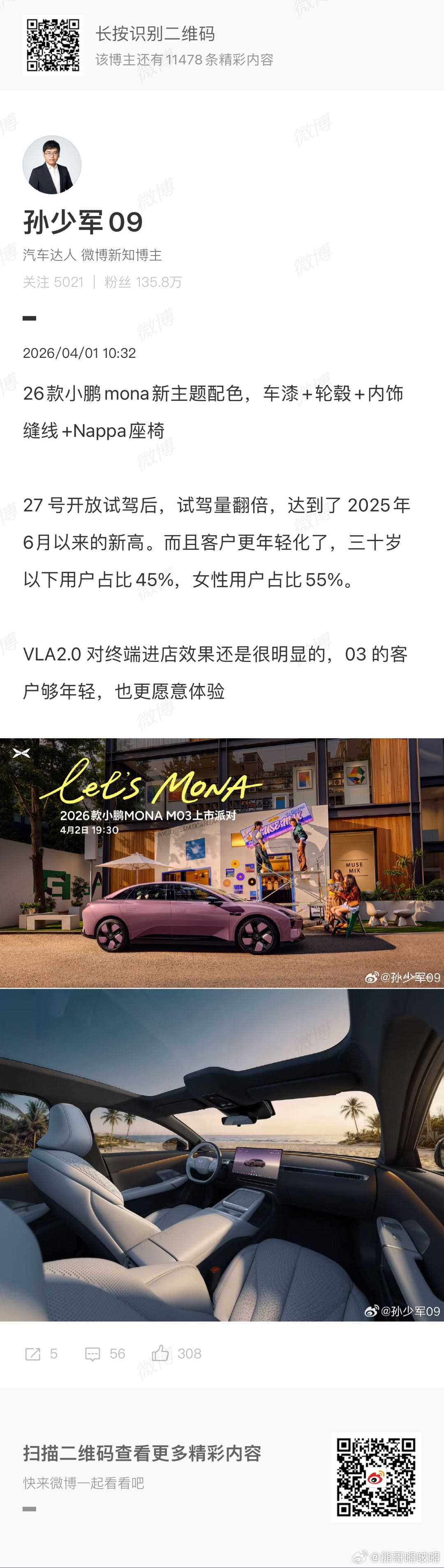 2026款小鹏MONA M03终端热度持续走高,自3月27日开放试驾以来,门店试驾量直接翻倍,上周末试驾量创下新高。新车凭借颜值、座舱、续航、主动安全等全面升级,精准俘获年轻用户,30岁以下用户占比45%,女性用户占比55%,持续成为市场上备受欢迎的热门车型。新款小鹏MONA门店试驾量翻倍创新高