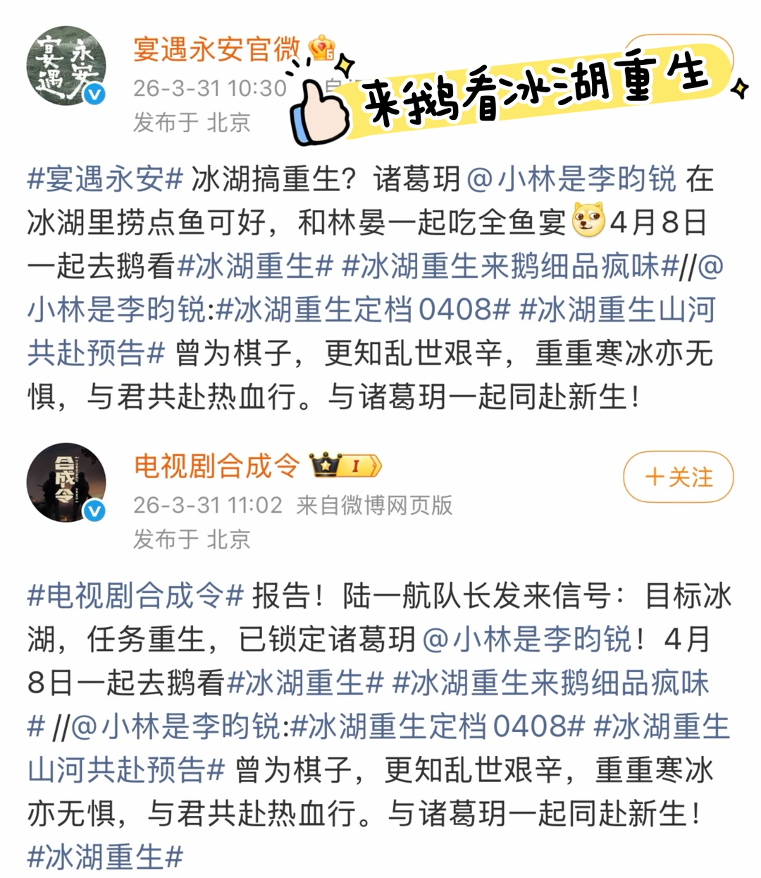 🐧摇来了李昀锐的过往角色给《冰湖重生》应援啦! 《九重紫》宋墨、《宴遇永安》林宴、《致1999年的自己》肖涵、《尚公主》言尚、《合成令》陆一航……来都来了[偷笑R]都下冰湖捞诸葛玥吧! 预告里小林又帅又惨的,完全活人微“疯”来着!《冰湖重生》定档4月8日,在🐧开播,燥候诸葛玥!