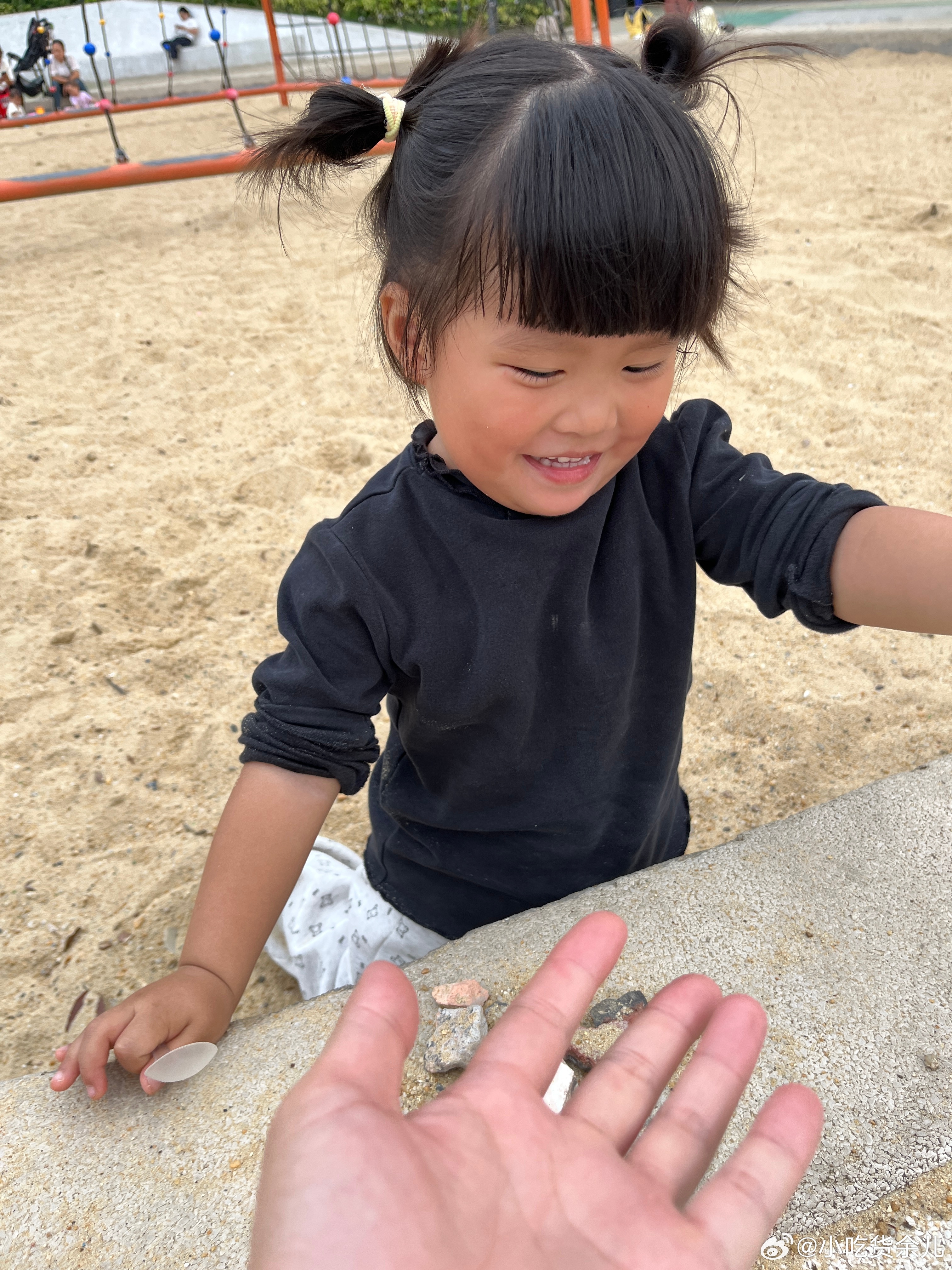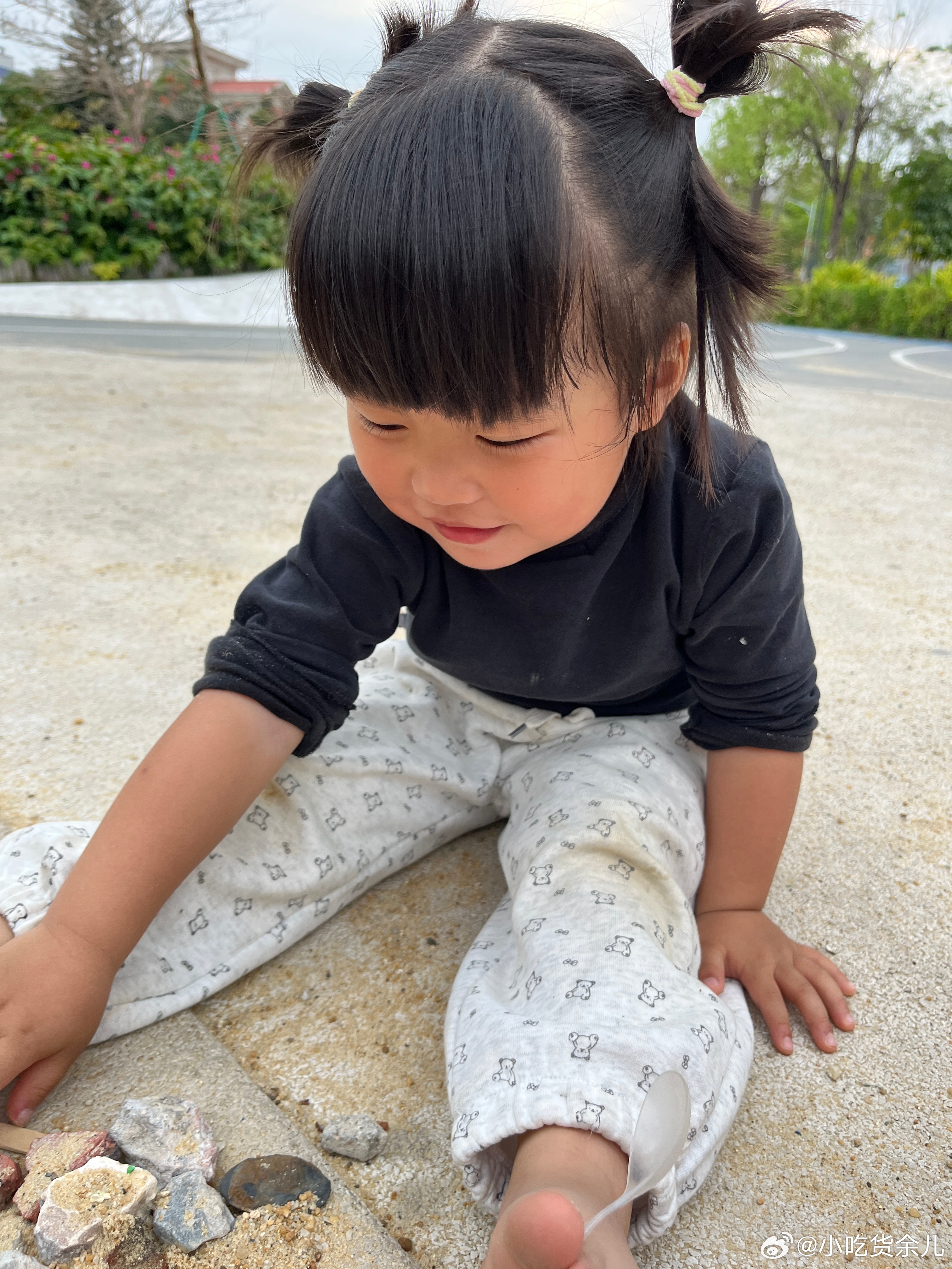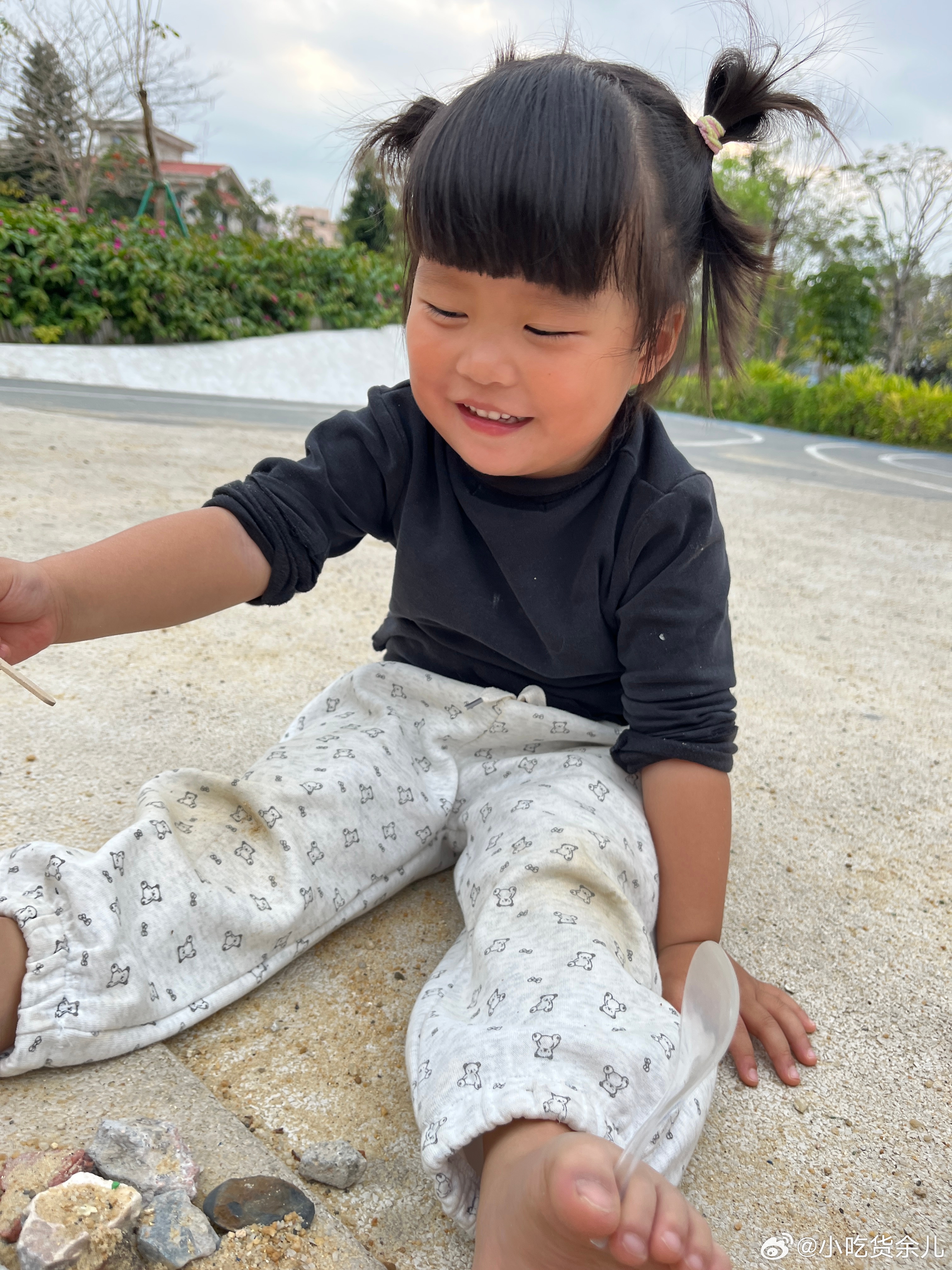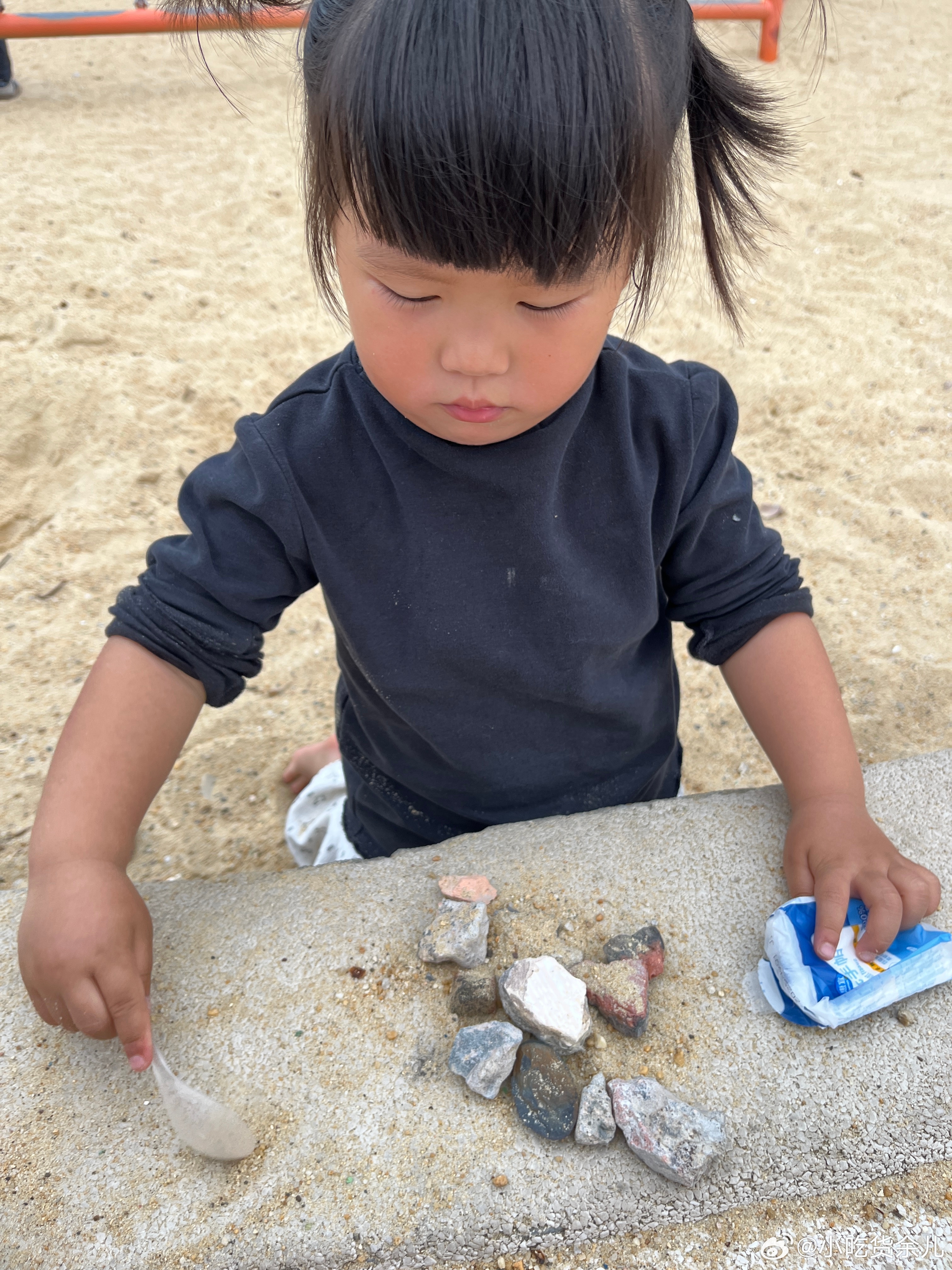 玩够了,回家。手机藏着东西,叫我猜一下在哪只手。捡了一大堆石头,在用两只脚表演。