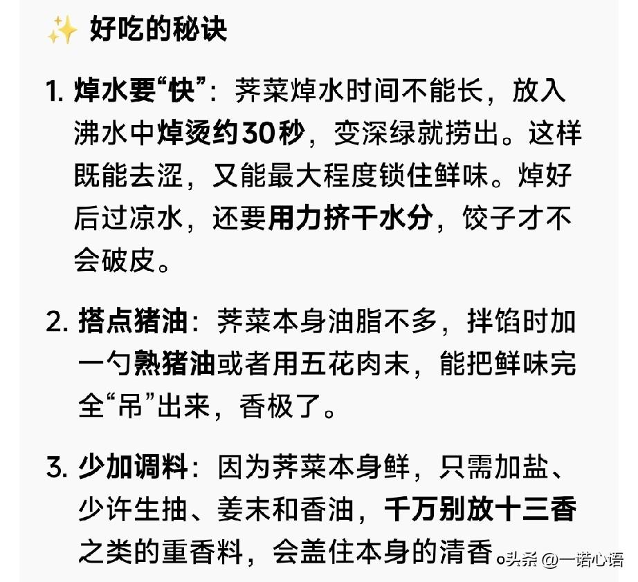 晚上,第一次包荠菜馅饺子,我献宝似的给两闺女打电话,“大闺女说:荠菜馅?没听说过,不吃。二闺女说:在饭店吃过,不好吃,不吃。” 听完,我是真失望。本以为大家都能踊跃报名呢!结果,没人屌! 不吃拉倒,你们不吃我吃! 还好,大外孙子挺捧场,他说他吃。 饺子热气腾腾出锅了,结果,超级好吃。老公说:又香、又清新,从来没吃过这么好吃的饺子。大外孙子也说好吃,吃完,颠颠儿给她妈端了5个,大闺女吃完,也说好吃。 明天早市还去买点荠菜,包点馄饨,估计也能好吃。 趁清明前抓紧吃,过了清明荠菜就没有这么鲜嫩了! 备注:“好吃的秘诀在下面的图片里,想吃的友友要仔细阅读哟”![呲牙] 还有荠菜图片,挖荠菜一定要认真识别,和它长的像的菜有许多哟!
