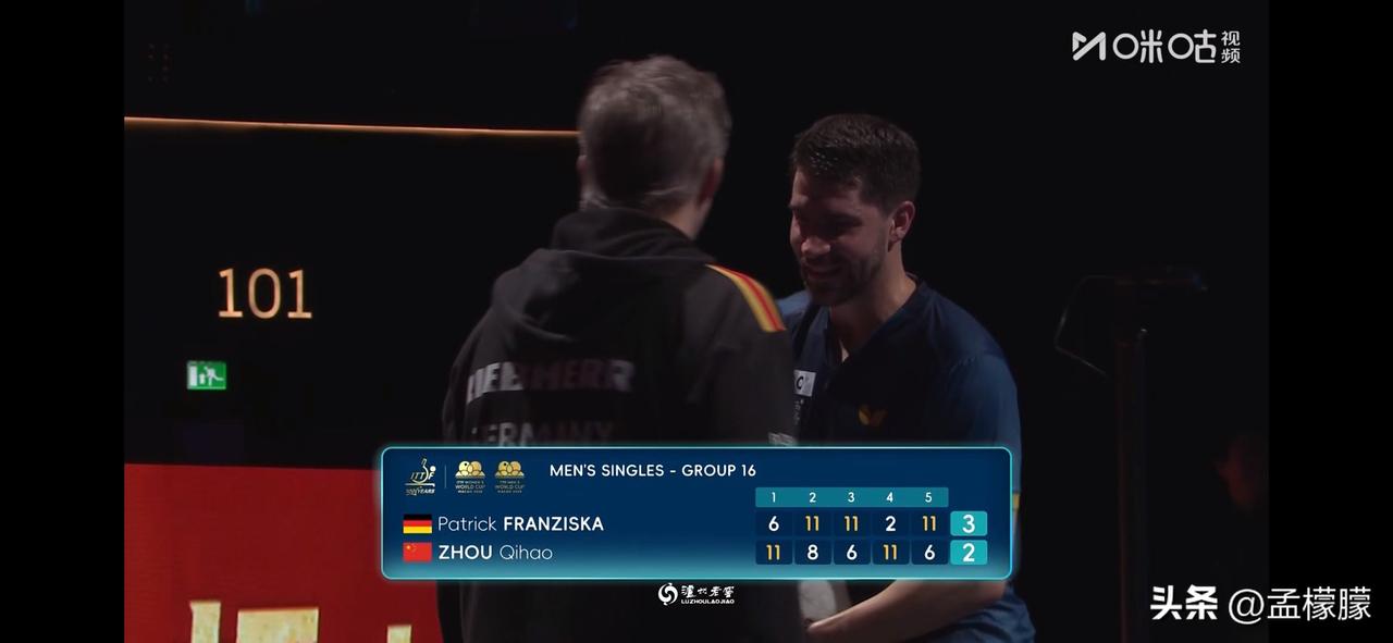 2-3不敌德国名将弗朗西斯卡,无缘晋级16强。在3位国乒 选手与德国选手生死战较量中,陈垣宇0-3邱党,梁靖崑2-3奥恰洛夫,周启豪2-3弗朗西斯卡。三位均告负,无缘小组出线 男单小组赛: 帕特里克·弗朗西斯卡(GER)3-2周启豪(CHN)【6-11,11-8,11-6,2-11,11-6】 。 在3位国乒 选手与德国选手生死战较量中,陈垣宇0-3邱党,梁靖崑2-3奥恰洛夫,周启豪2-3弗朗西斯卡。三位均告负,无缘小组出线(即第二阶段的淘汰赛),无缘16强。非常惋惜。 世乒单打世界杯 澳门男乒乓球 乒乓球 澳门世界杯