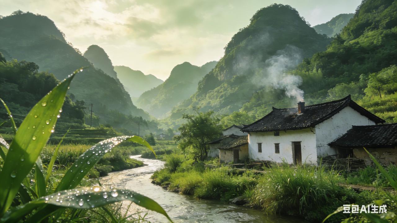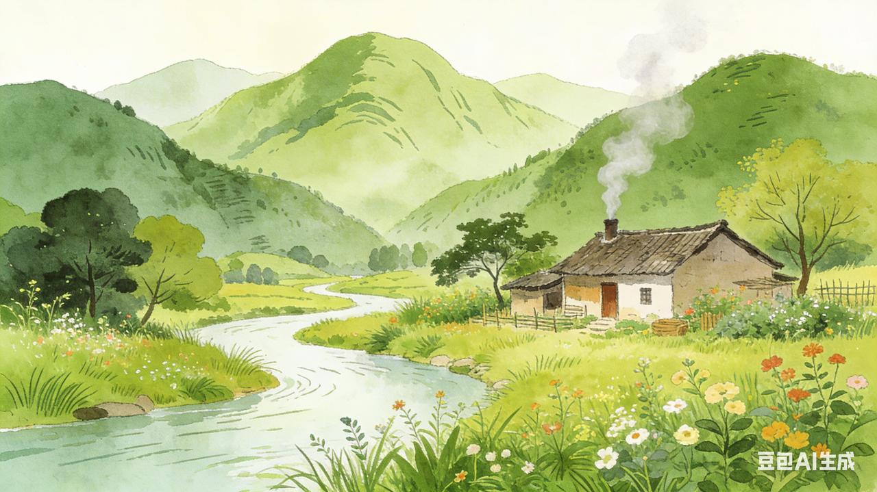 田园风光入画来,青山绿水绕农家,炊烟袅袅,草木葱茏,满是淳朴自然的诗意与温柔。